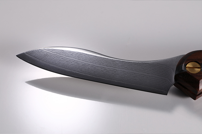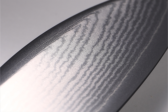 そしてその刃の部分には、昔の日本刀のような刃紋を想起させる積層鋼材のダマスカス刃を今回は特別に用意いたしました。それを担当してもらったのは岐阜・関の刃物職人「スミカマ」です。