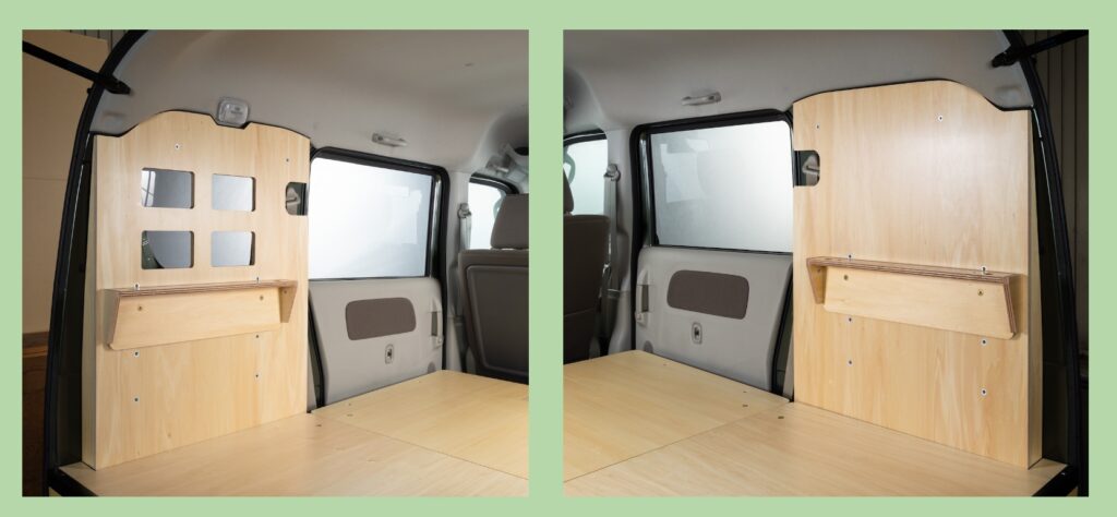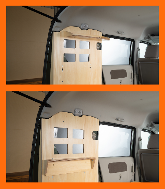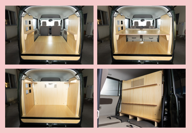 両サイドにウォールパネルを設置することで、一見狭くなるように思えますがこの壁があることで多様な使い方をすることができます。また壁があるだけで安心感が増し、助手席側のパネルには圧迫感から開放し運転時にも後方確認できるようお家のような小窓をあけました。こうした配慮や遊び心でCRAFTPLUSならではの1ROOMへと変身していくのです。