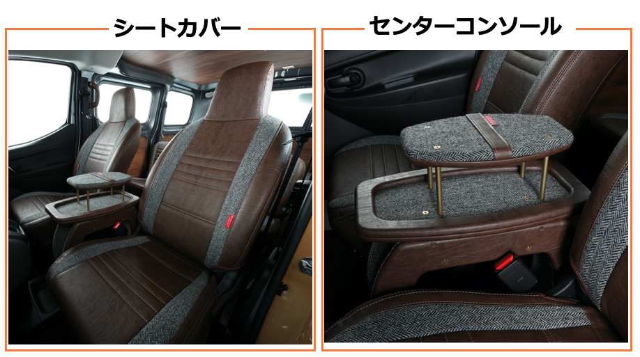 ◯ ニューヨークスタイルのファブリックで仕立てたシート&センターコンソール。無機質なバンの内装に、CRAFTPLUSが提案するのは「暮らしを感じるカスタム」。