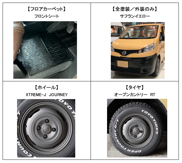 外装は目を引くサフランイエローに全塗装し、印象をガラリと一新。足元には、無骨さとレトロ感を兼ね備えたXTREME-J JOURNEYホイールと、オールラウンドに対応するTOYOオープンカントリーRTタイヤ(ホワイトレター)を装着し、スタイルと機能性を両立。室内には、フロアカーペットを採用し、実用面も抜かりなし。