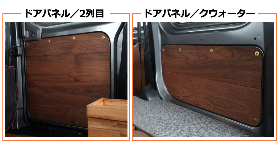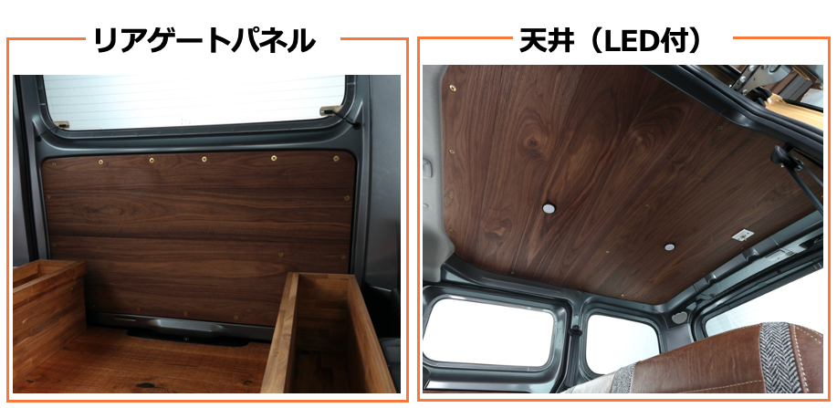 ◯ ドアパネル・リアゲート・天井パネルには、贅沢に無垢材を使用。LED付きの天井がやさしく車内を照らし、まるでログキャビンのような居心地を演出します。