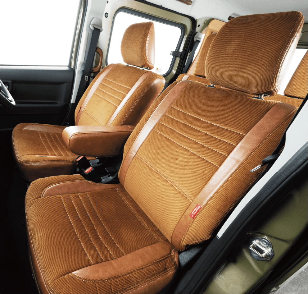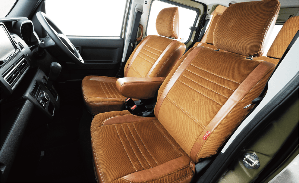 300車種以上の豊富なラインナップを誇るクラフトプラスのシートカバー。「カリフォルニアスタイル」、「ブルックリンスタイル」、「ニューヨークスタイル」の3つのシリーズ展開とさらにそれぞれにタイプ1、タイプ2と生地の配置やデザインを変えた2種類をラインナップに揃え、実質6種類からお選びいただけます。純正の室内イメージを自分好みのデザインに変えられるのはもちろん、ウッドの無垢材との相性も抜群です。写真はキャメル色のレザー素材にコーデュロイ生地を合わせたブルックリンスタイル・タイプ2。車内という室内空間にファッションシーン由来の素材も取り入れる自由な発想が特徴のクラフトプラスだからこそ実現できたシートカバーです。