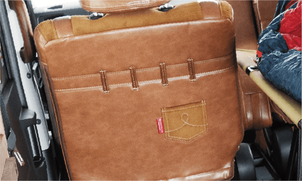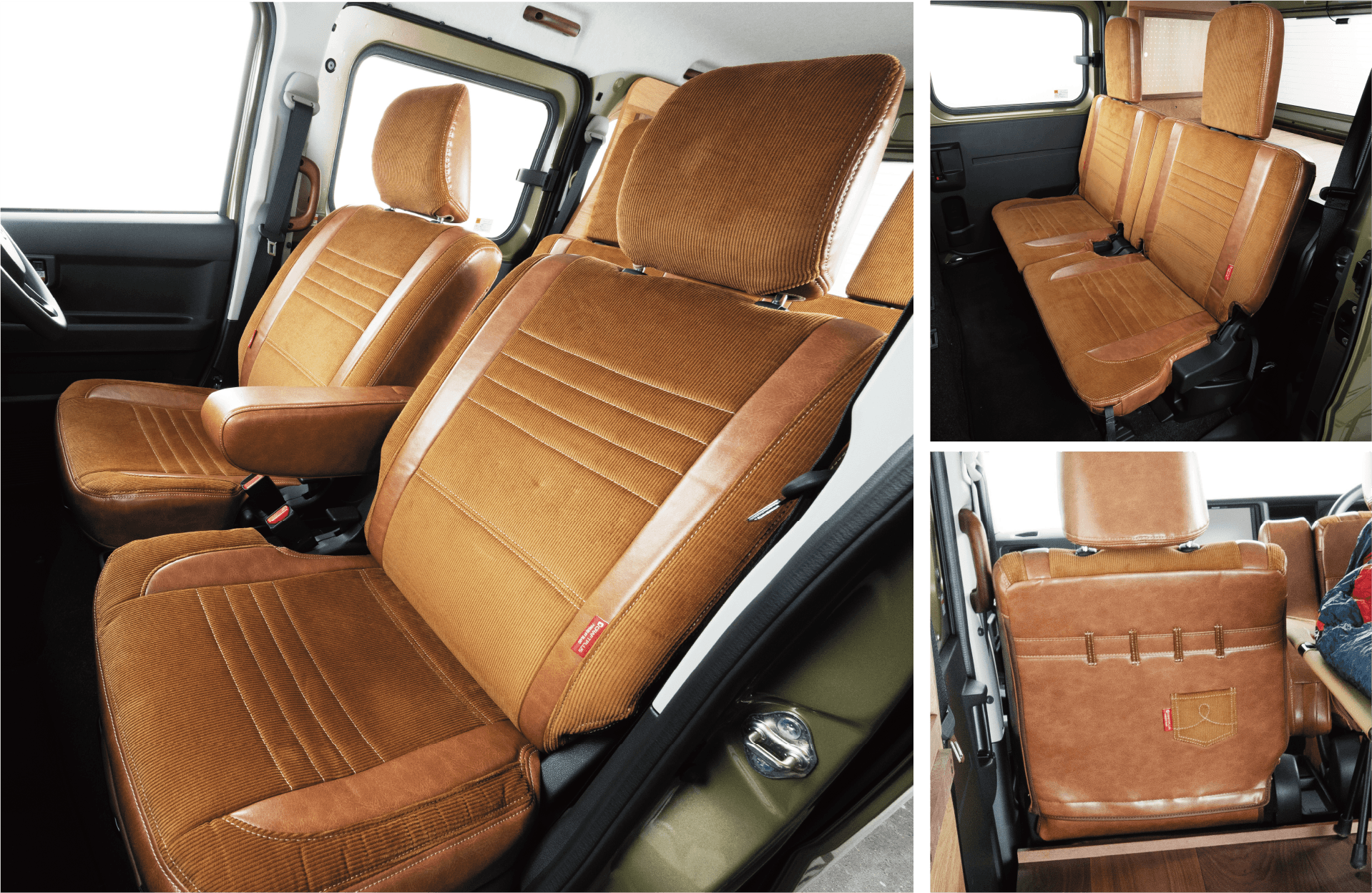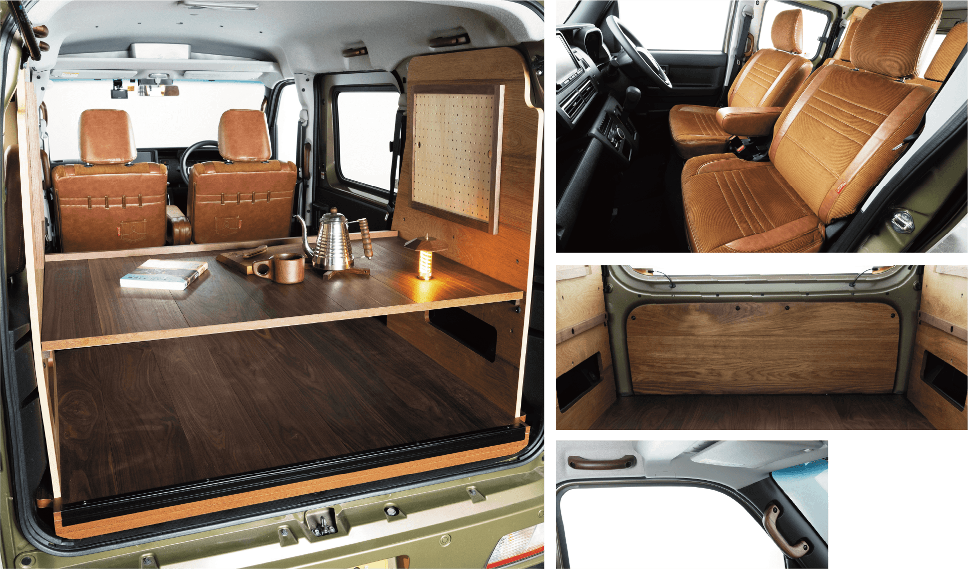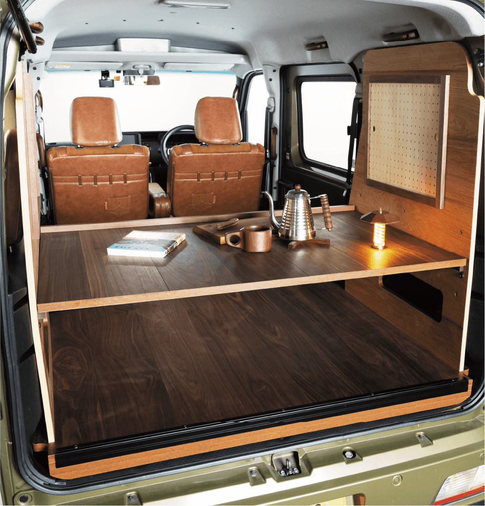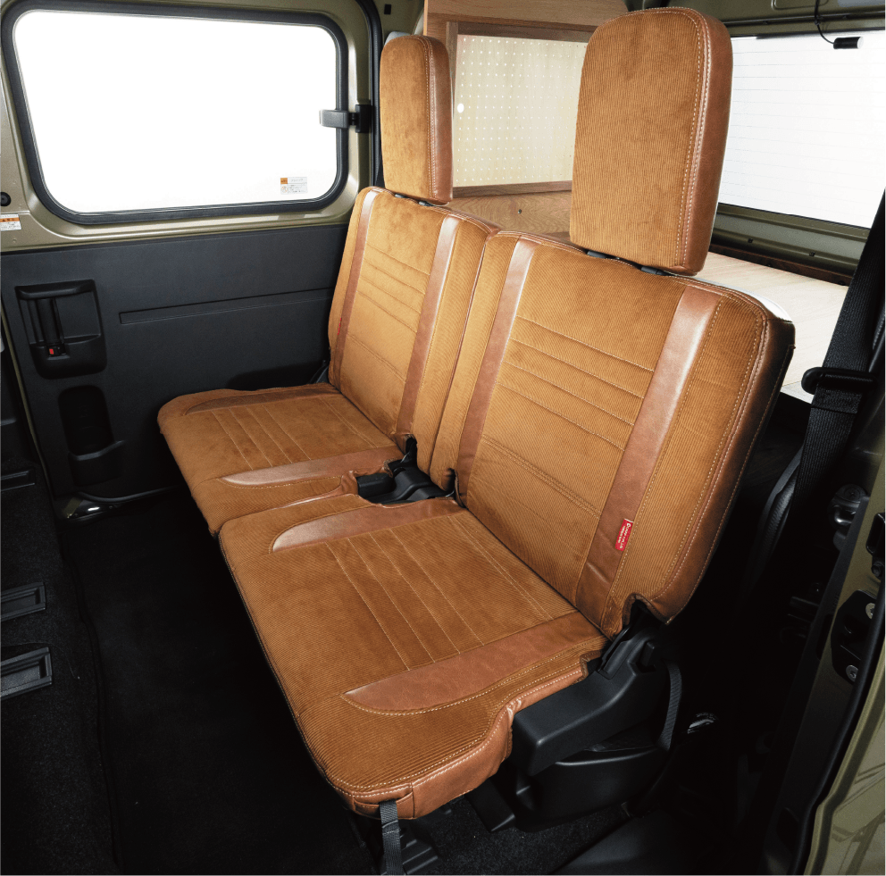 荷室の無垢材と合わせてDIY加工がしやすい仕様のリヤゲートパネルや触れるたびにいつも握っていたくなるアシストグリップ。機能性が最優先だった商用車の室内空間を、劇的に変えてくれて張り替えたかのようなフィット感が印象的なシートカバー。コンプリートキットによって全商品が装着でき、車内をトータルコーディネートできます。