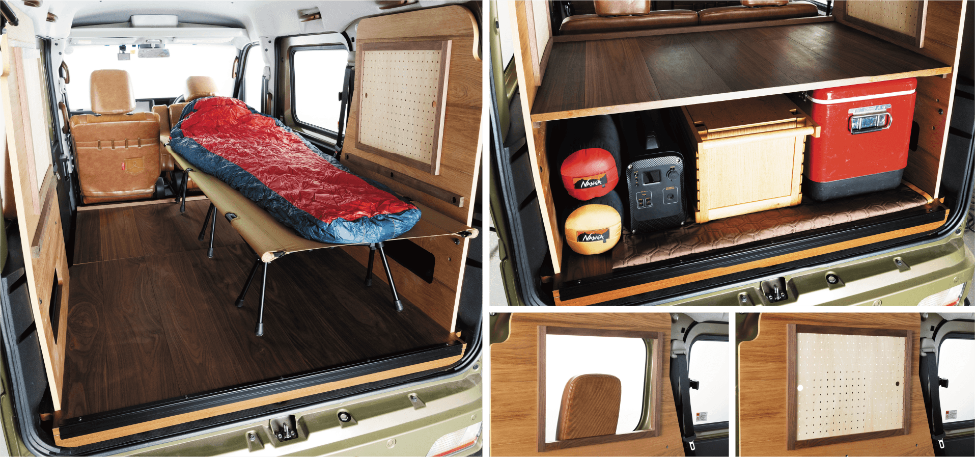 床一面に広がりフルフラットスペースへと変化するカーゴパネル。荷室に展開すれば上下2段に荷物を積める棚として機能します。荷室の両サイドに壁面となって展開するウォールパネルには、カーゴパネルのガイドが備え付けられており、荷室に積みたい荷物の大きさによって高さが上段・中段・下段と高さを3段階に調節可能です。ウォールパネル上部は無垢材のウォールナットと有孔ボードが印象的です。この有孔ボードにあけてある左右の穴を両サイドから持ち上げれば取り外しが可能。そのまま純正の窓を生かしたり、2列目シートの純正ヘッドレストの収納も可能。ラゲッジに装備の小物入れやシガーソケット部へとアクセスできるようにカバーはせずに設計。便利な純正機能もそのまま使用できるデザインとなっております。