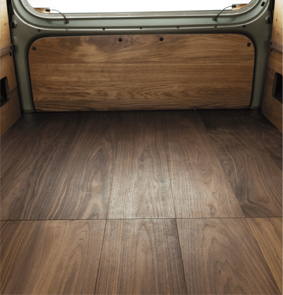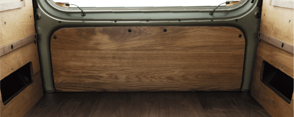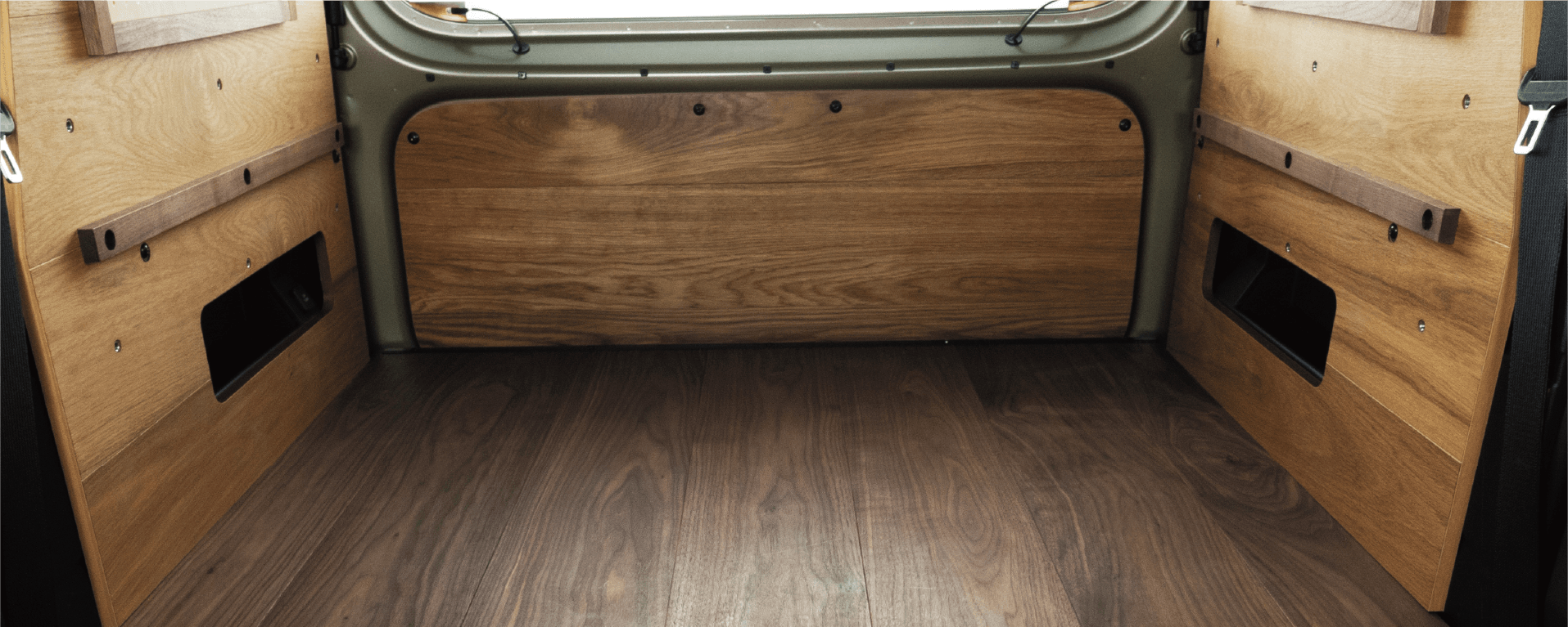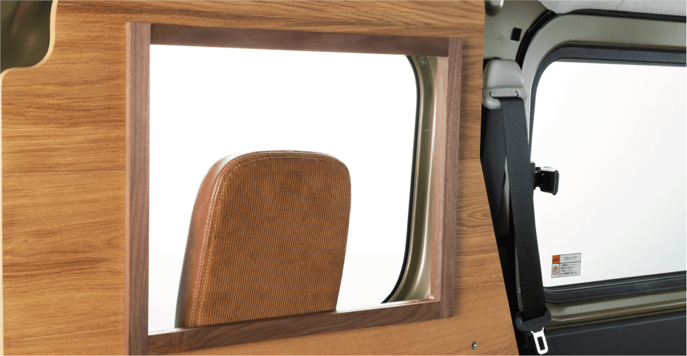 カーゴ部のドア開閉を担うリヤゲート。そのドアの内側にはウッド製のパネルをご用意しました(※装着時は簡単な加工が必要)。室内から…、リヤゲートを開けた際…、なにかと目にすることの多いこの場所に、床パネル、荷室パネルとウッドの質感で統一すればデザイン面での完成度はさらに高まります。走行中、荷室の床面から荷物がズレてしまった際にはリヤゲートのドアに当たる時の緩衝材としてゲート自体を保護する役割としても役立ちます。使い込んでエイジング効果が発揮できればさらに愛着を増す仕様です。素材が加工のしやすい無垢材ですので、ここにご自身でDIY加工してフックなどを取り付けるなど自分らしく楽しんでいただくことも可能です。