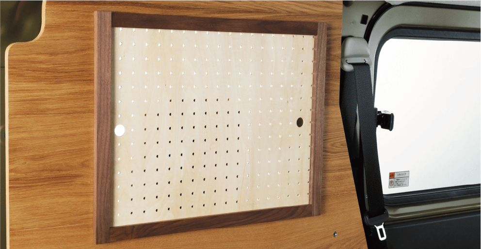 ウォールパネル上部は無垢材のウォールナットと有孔ボードが印象的です。この有孔ボードにあけてある左右の穴を両サイドから持ち上げれば取り外しが可能。そのまま純正の窓を生かしたり、2列目シートの純正ヘッドレストの収納も可能。ラゲッジに装備の小物入れやシガーソケット部へとアクセスできるようにカバーはせずに設計。便利な純正機能もそのまま使用できるデザインとなっております。
