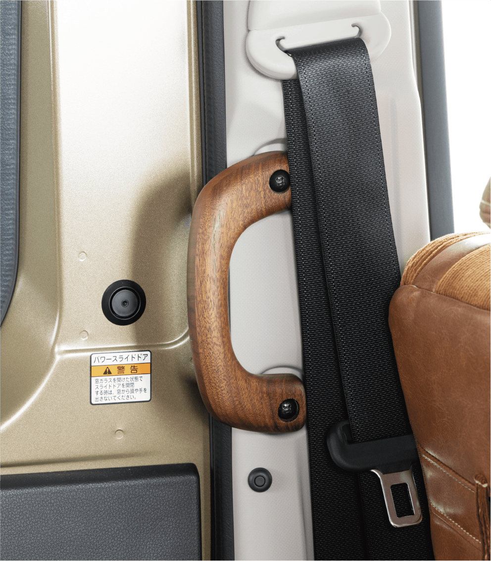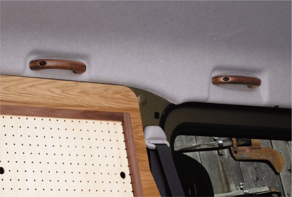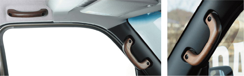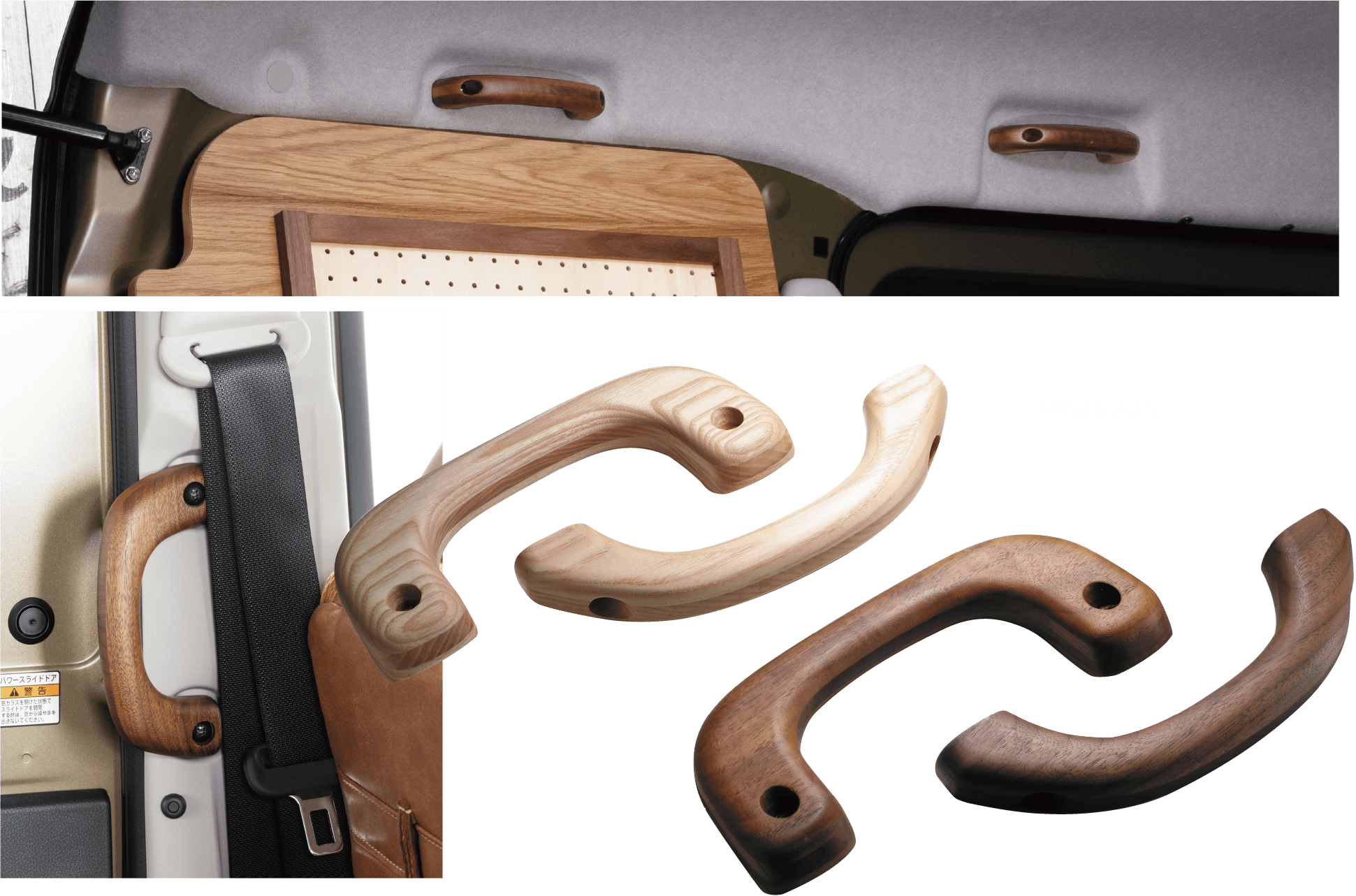 機能的ではあるものの無機質な純正の室内に対し、リアルウッドの無垢材の彩りがプラスされ、個性的なバンライフにもぴったりなアシストグリップ。乗り降りの際に必ず触れるものだからこそ、このサラッとした握り心地やスベスベとした木肌のキメ細かさは触れるたびにシックリと馴染みます。木が呼吸することや強度まで考えて職人がひとつひとつ木素材を張り合わせ、削り込み、磨き、徹底して握り心地にこだわった渾身の作。アトレーには運転席に1個と助手席に2個の3個が標準仕様となります。オプションとして2列目に2箇所、カーゴ部上部に2箇所、さらに左右スライドドアからの乗り降りの際に非常に便利な左右2箇所の合計9箇所に設定が可能です。