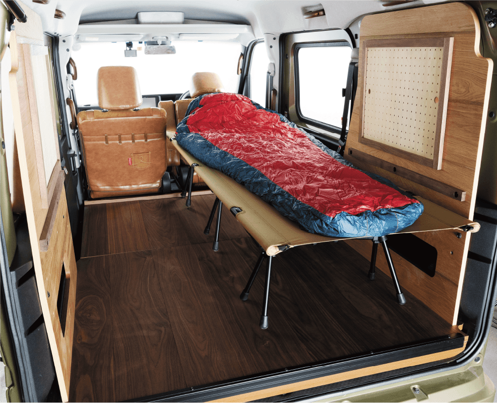 カーゴパネル、ウォールパネル、リヤゲートパネル、シートカバー、アシストグリップと5つの商品からなるキットがコンプリートとして販売されています。カーゴパネルとウォールパネルを組み合わせる事で、カーゴキットとなりその用途は2〜3WAYへと変化するのも魅力的。自分好みに高さ調整やレイアウトをアレンジできます。荷室の無垢材と合わせてDIY加工がしやすい仕様のリヤゲートパネルや触れるたびにいつも握っていたくなるアシストグリップ。機能性が最優先だった商用車の室内空間を、劇的に変えてくれて張り替えたかのようなフィット感が印象的なシートカバー。コンプリートキットによって全商品が装着でき、車内をトータルコーディネートできます。