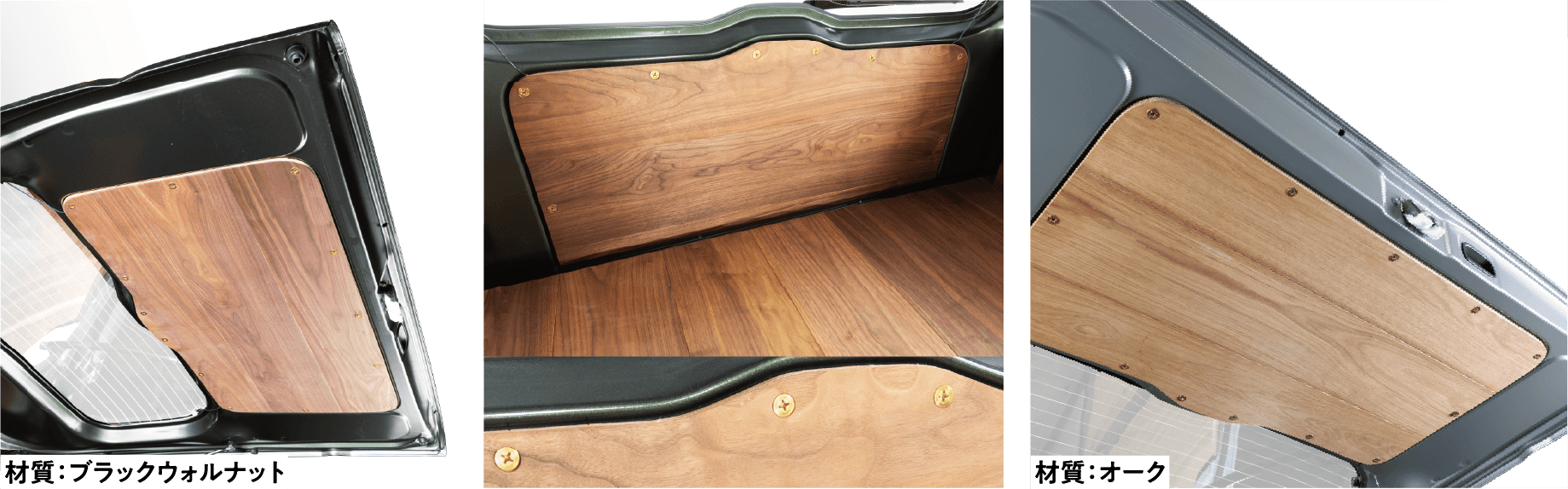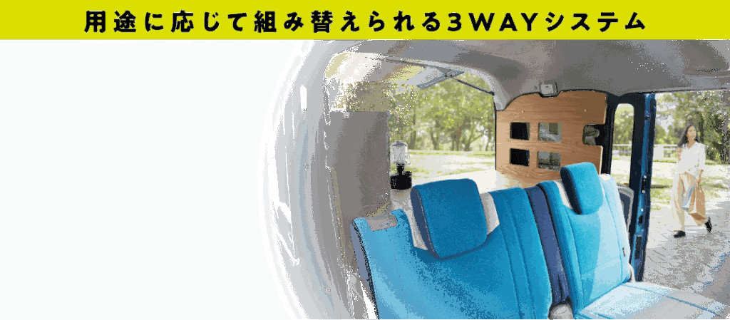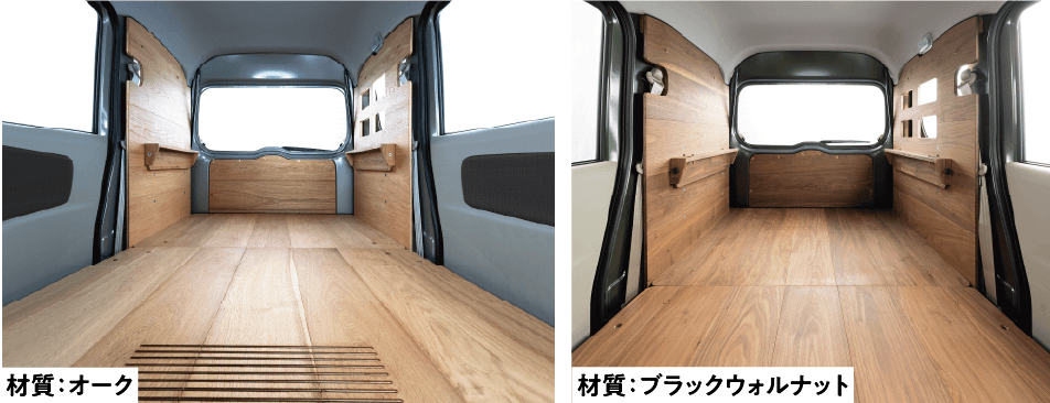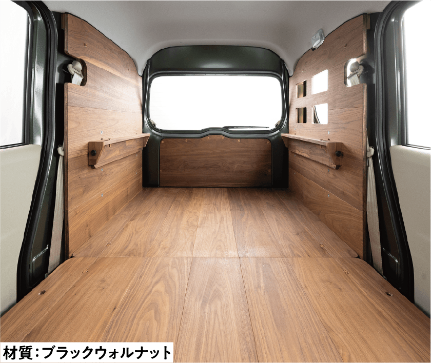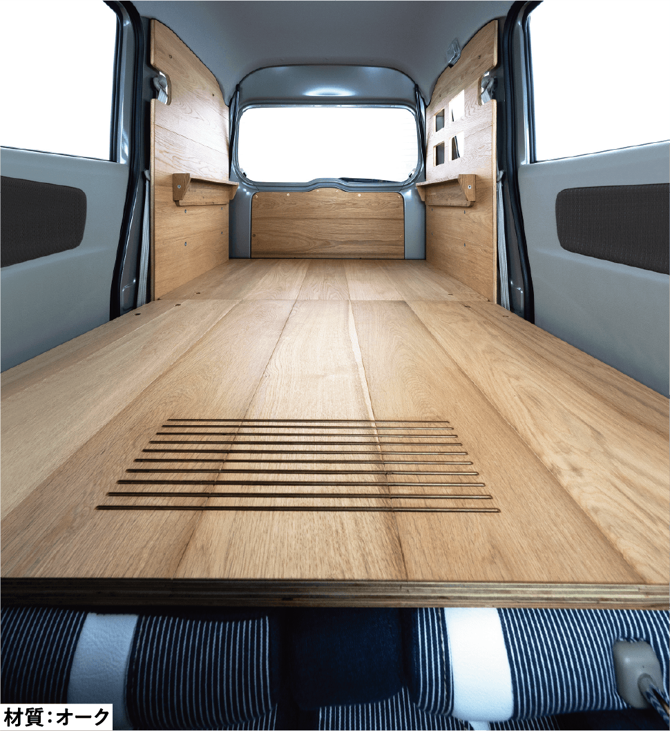 小さいながらも木の壁3面で覆った小部屋が出現する壁板仕様。この部屋の使い方は自分しだい。床板に使用している壁を立てれば後席シートも使用できます。