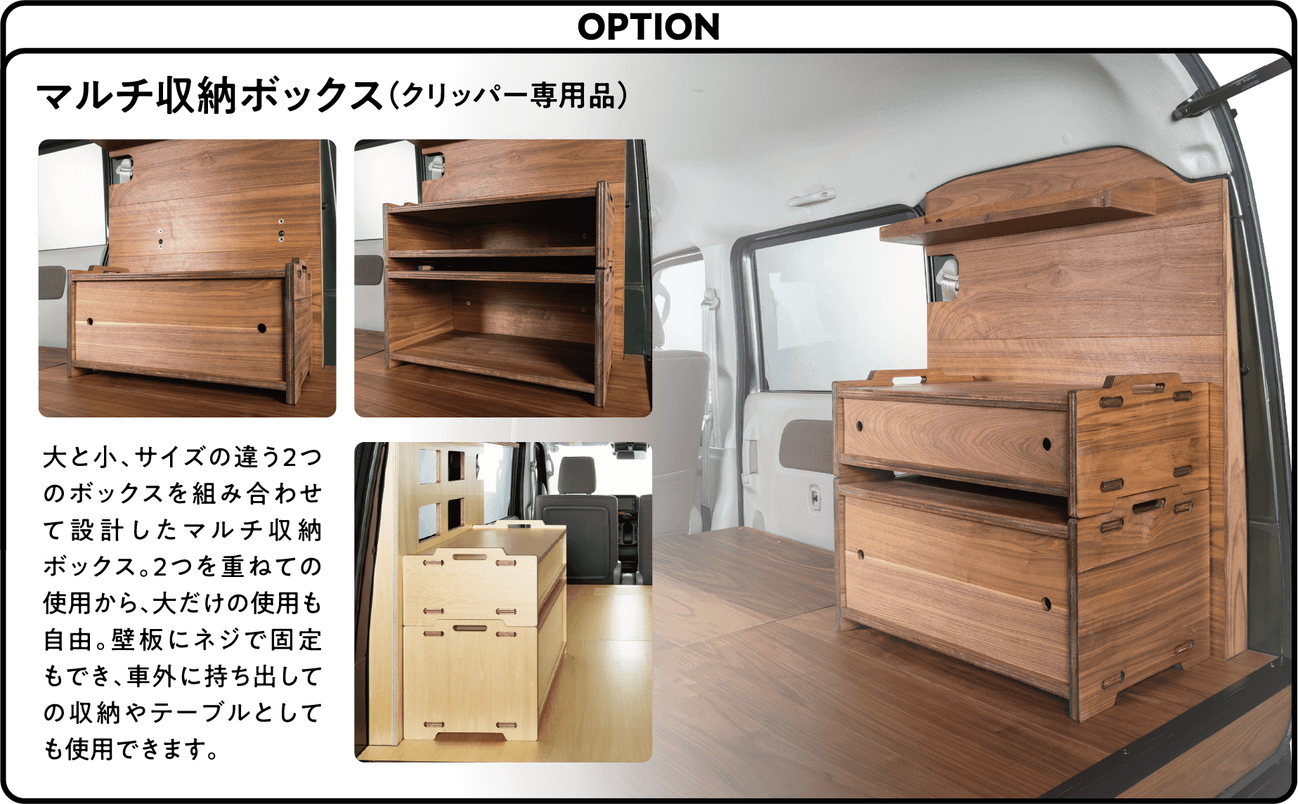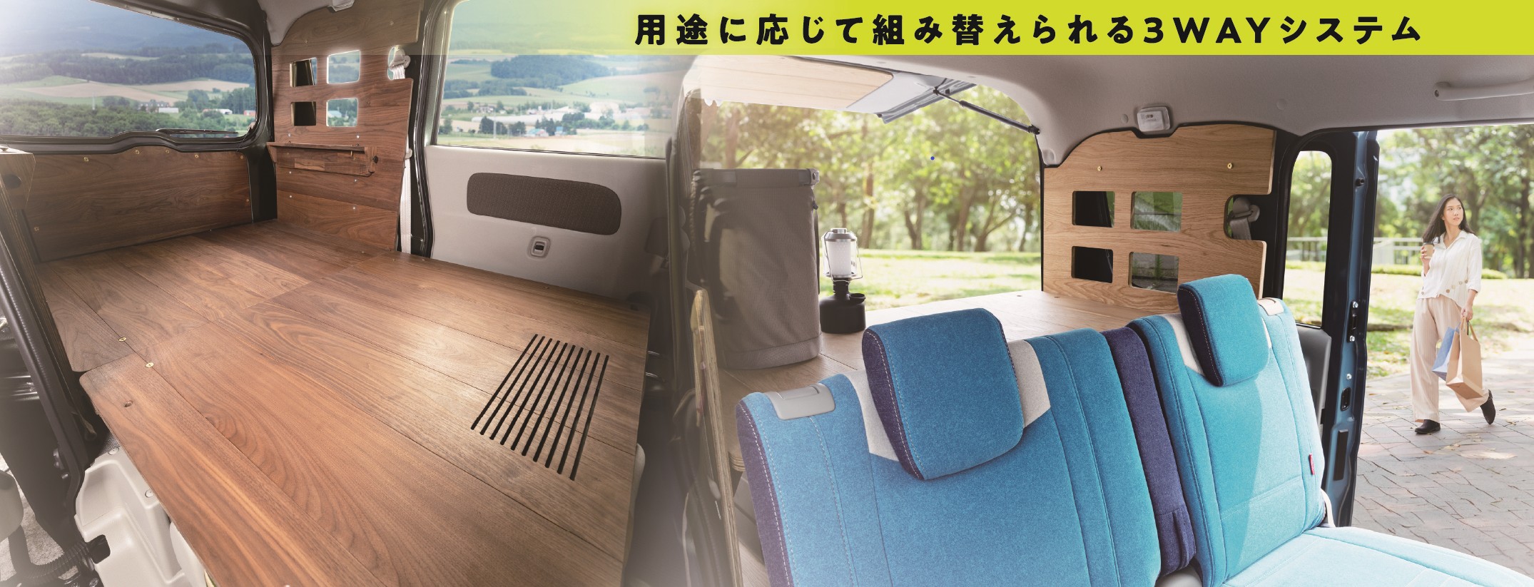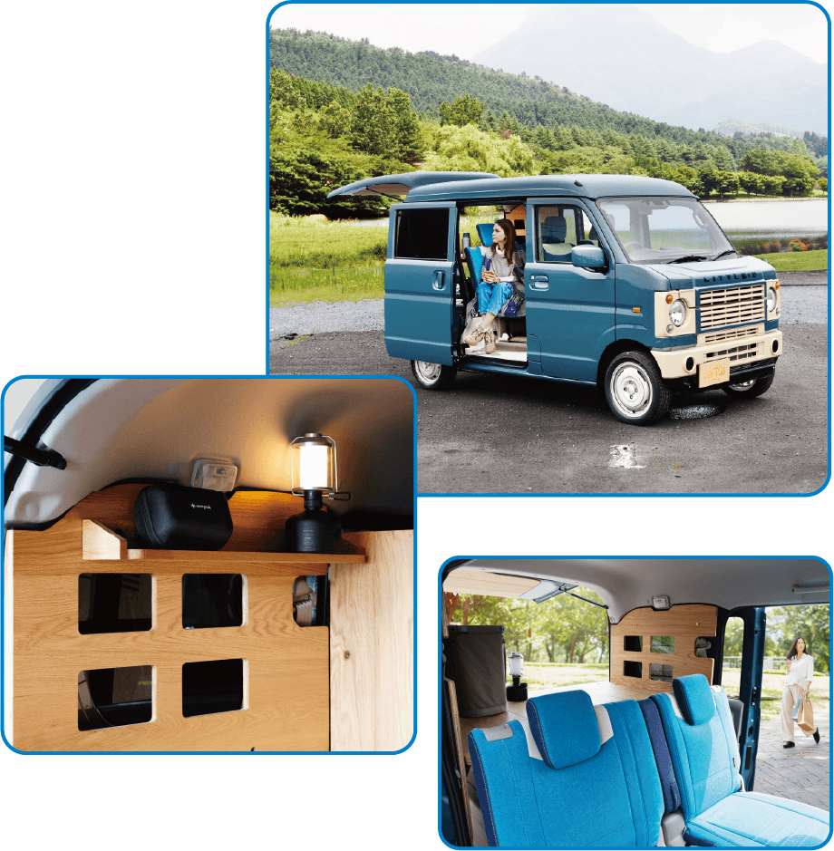 小さいながらも木の壁3面で覆った小部屋が出現する壁板仕様。この部屋の使い方は自分しだい。床板に使用している壁を立てれば後席シートも使用できます。