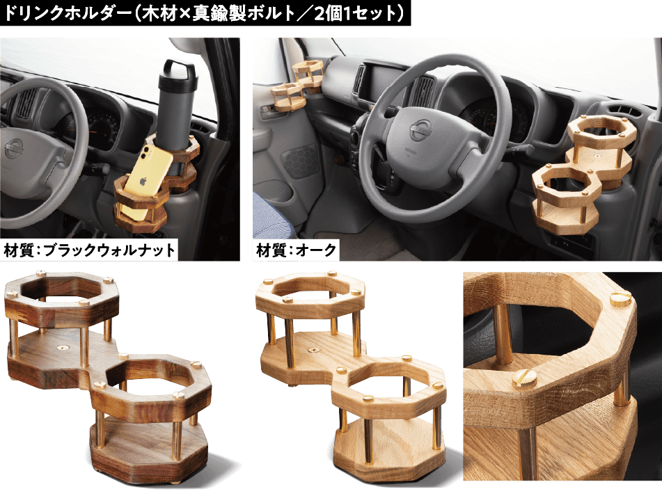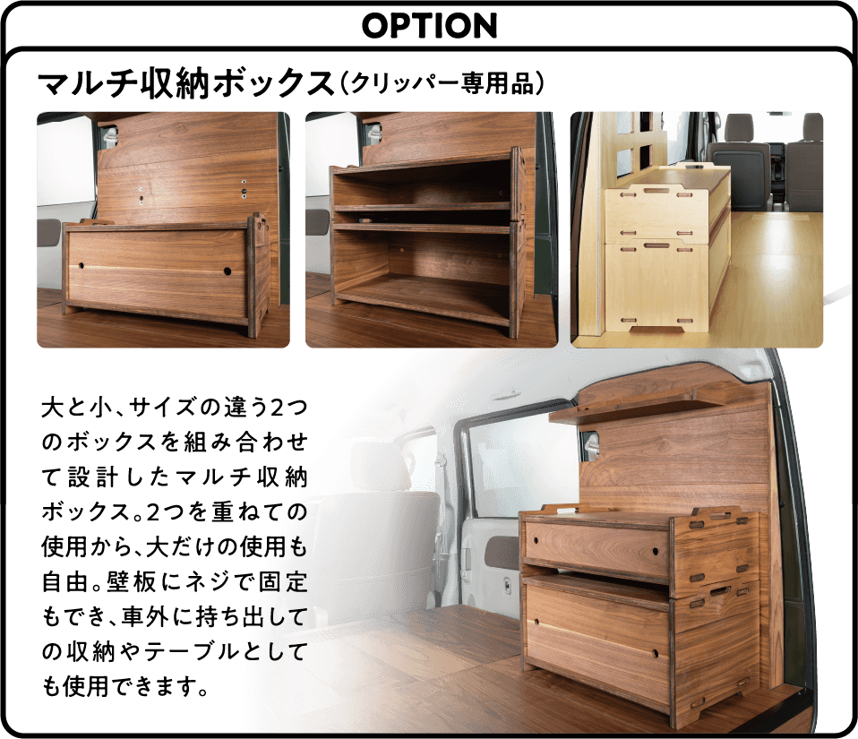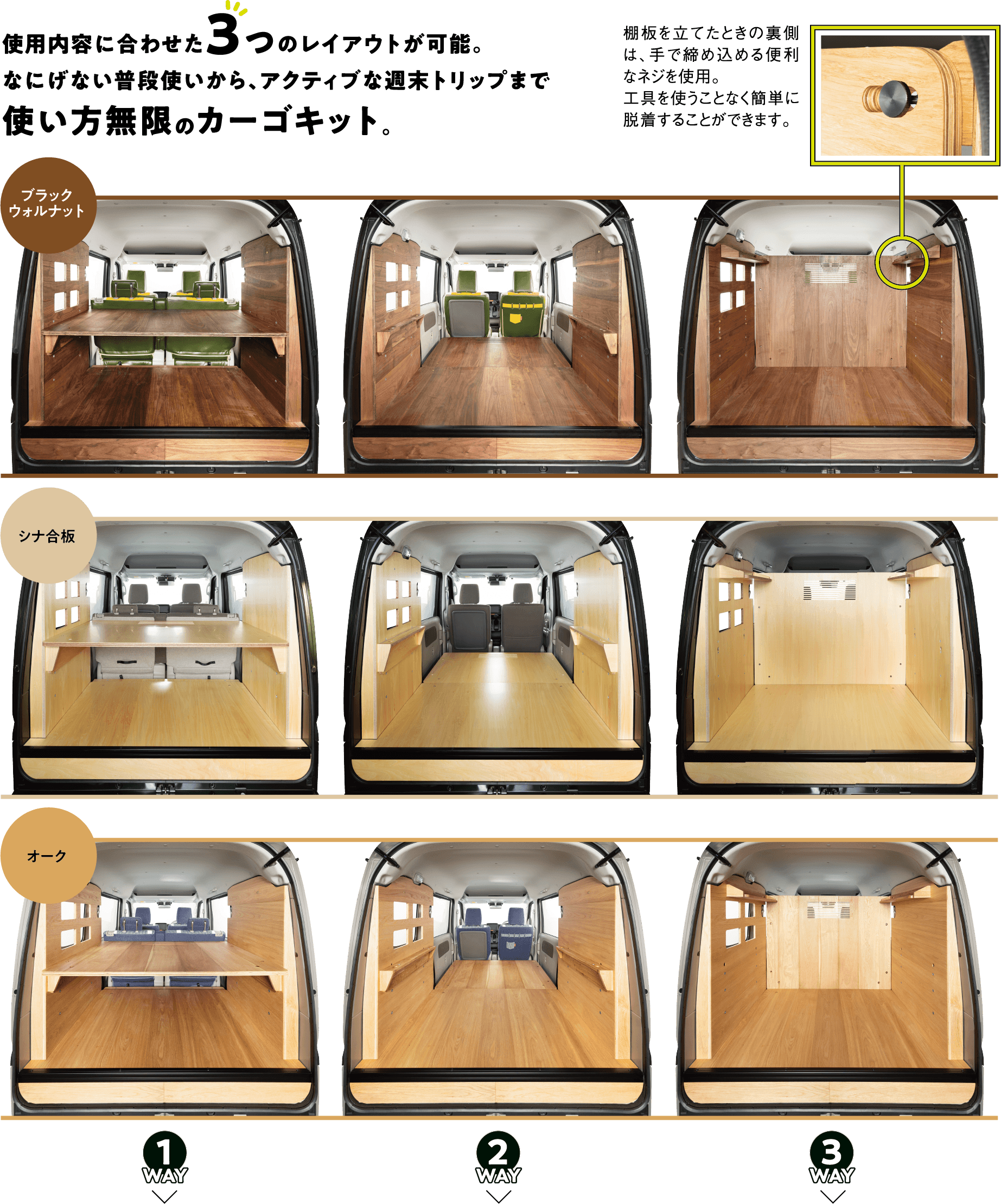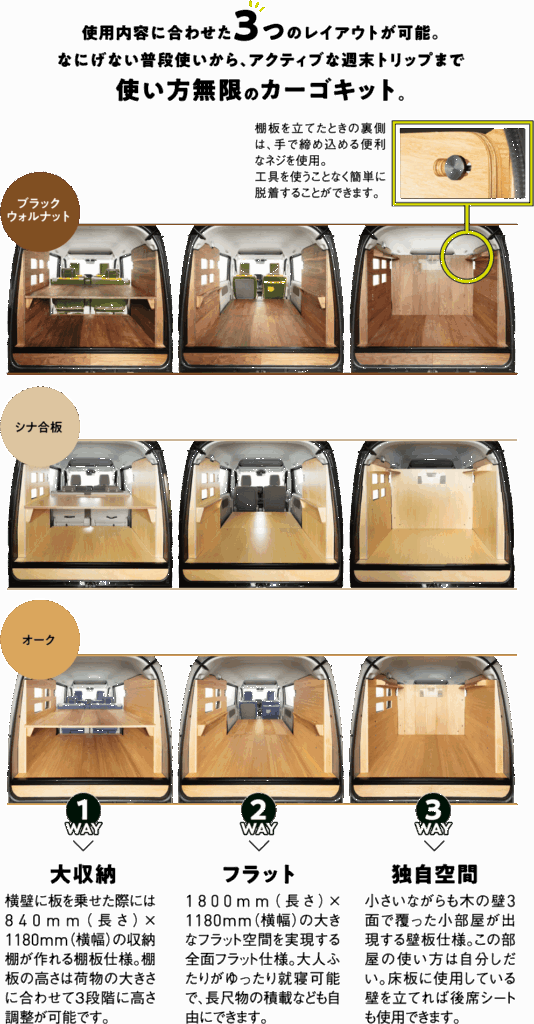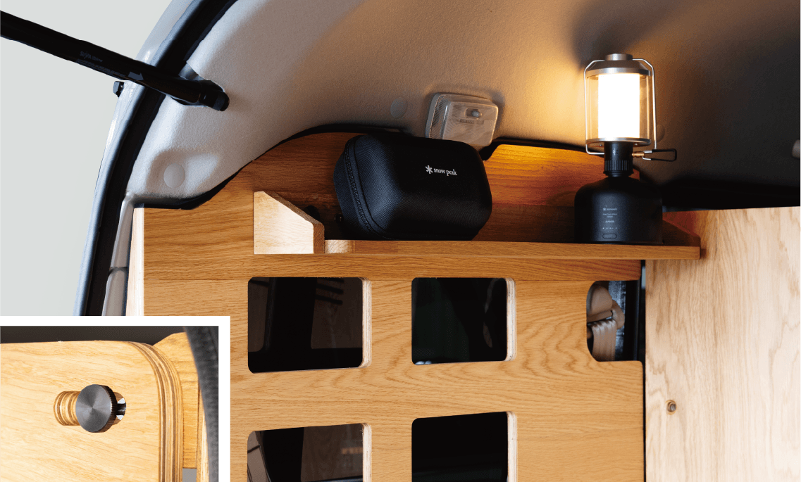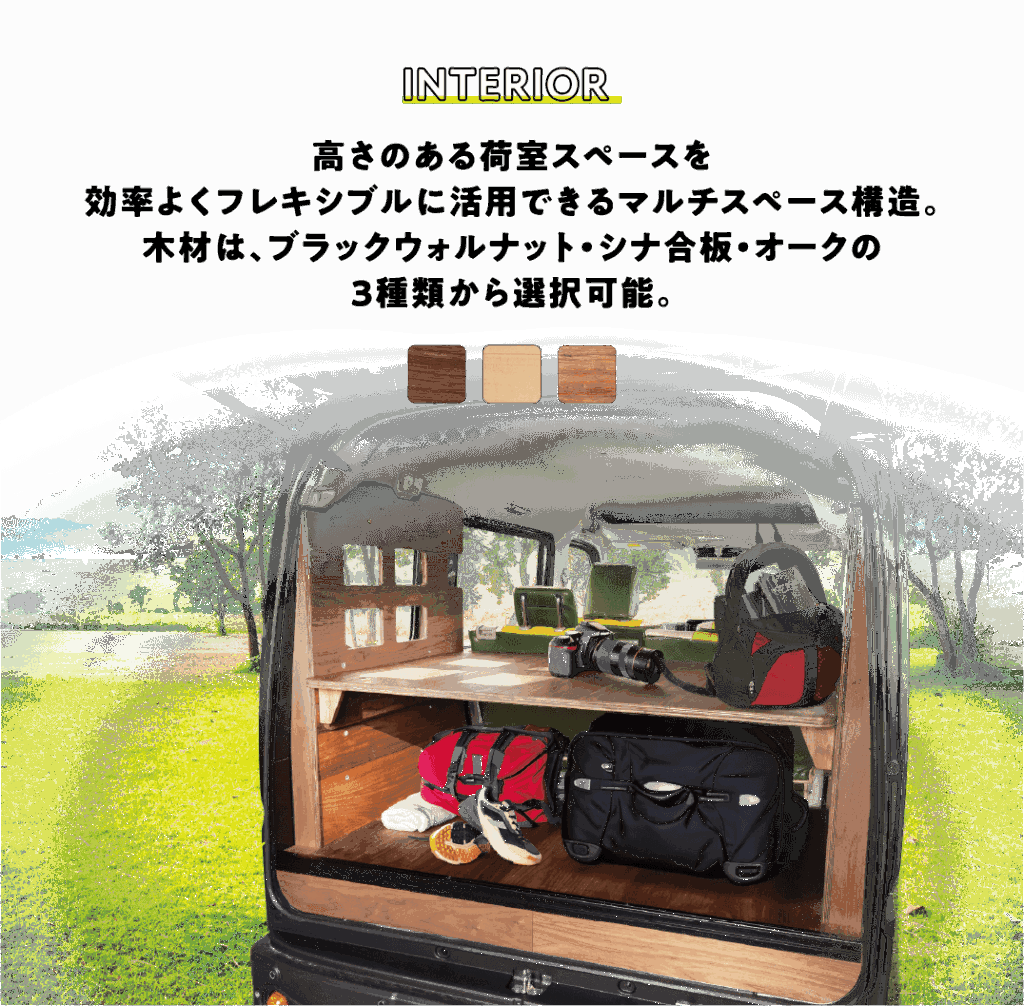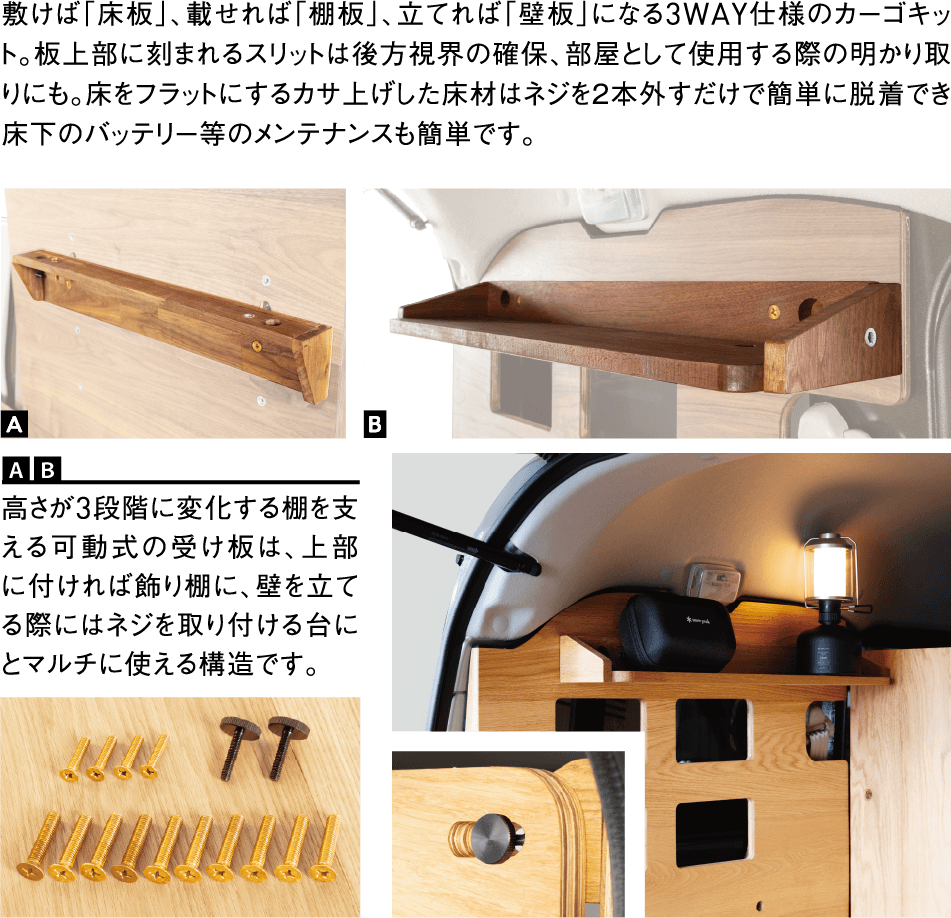 敷けば「床板」、載せれば「棚板」、立てれば「壁板」になる3WAY仕様のカーゴキット。板上部に刻まれるスリットは後方視界の確保、部屋として使用する際の明かり取りにも。床をフラットにするカサ上げした床材はネジを2本外すだけで簡単に脱着でき床下のバッテリー等のメンテナンスも簡単です。