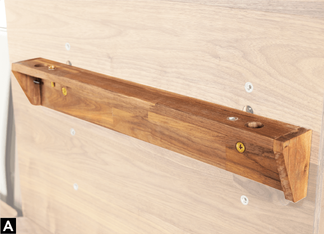 高さが3段階に変化する棚を支える可動式の受け板は、上部に取り付ければ飾り棚に、壁を立てる際にはネジを取り付ける台にとマルチに使える構造です。