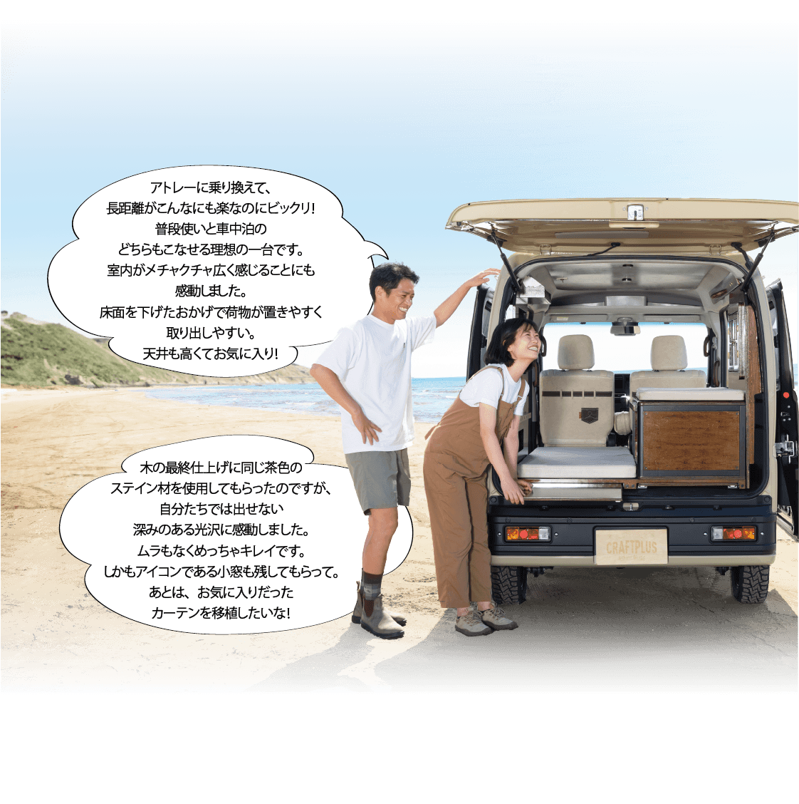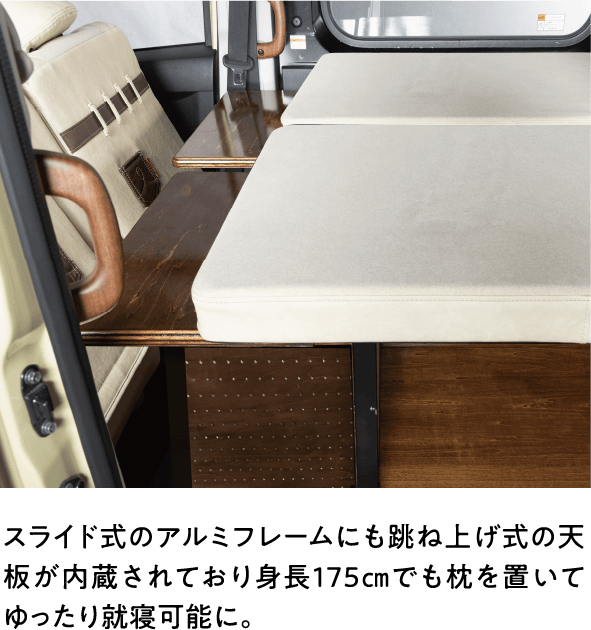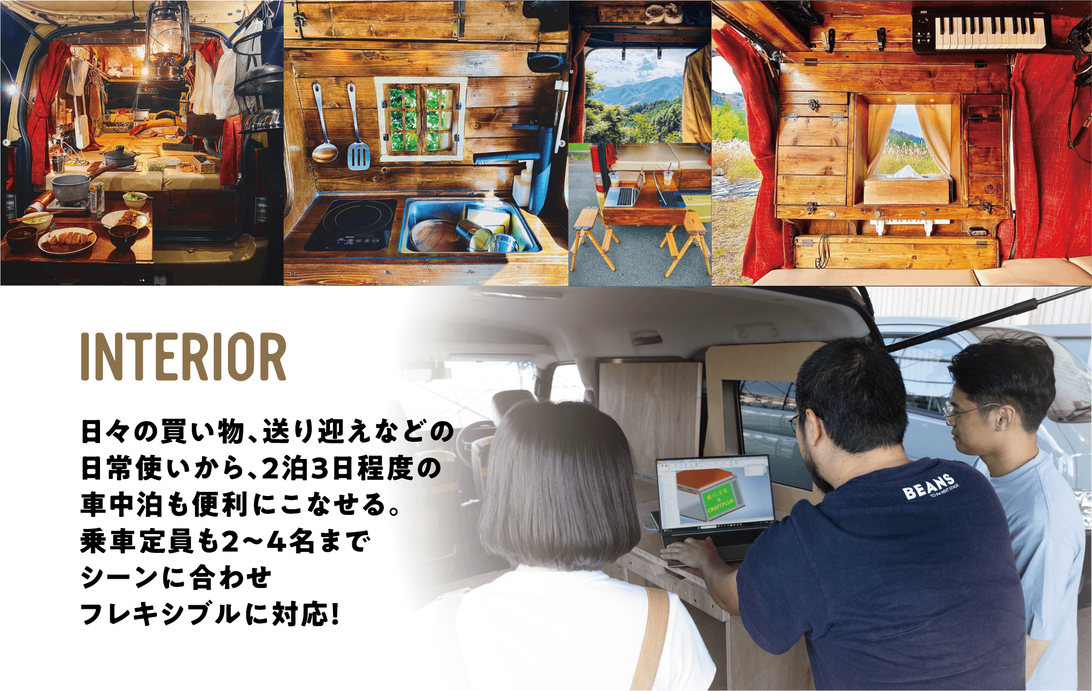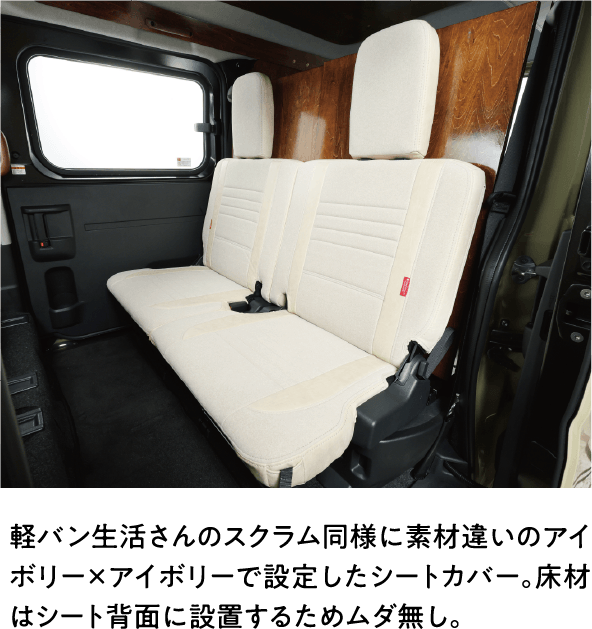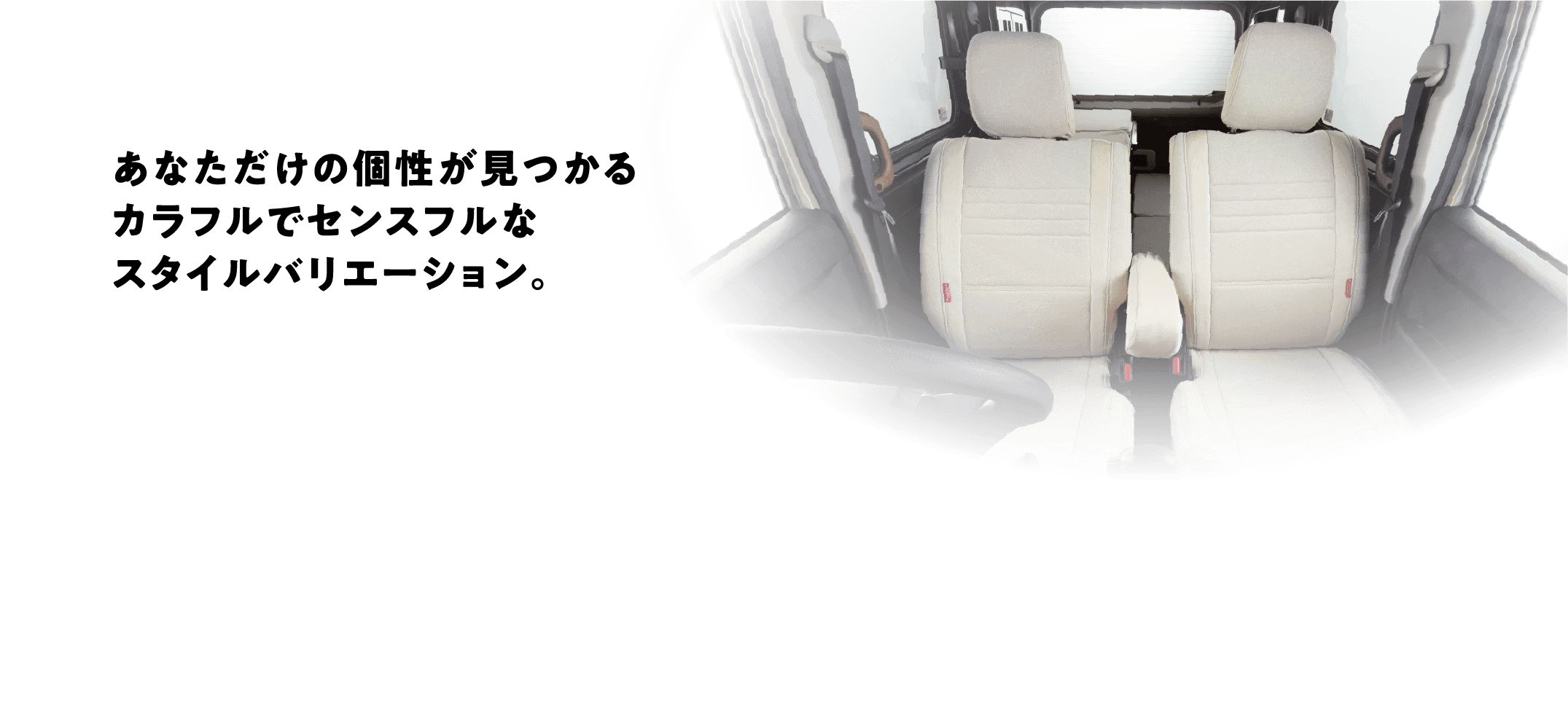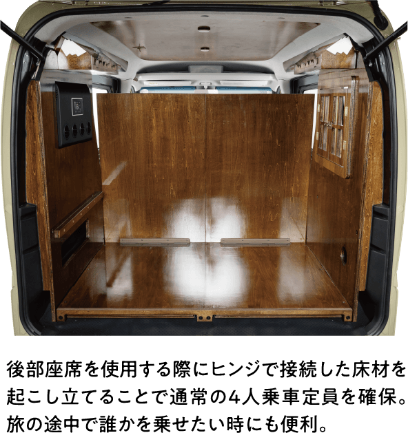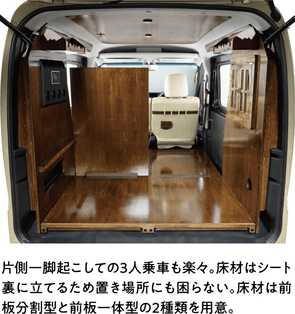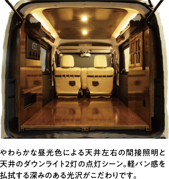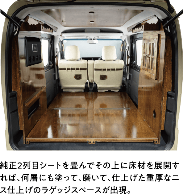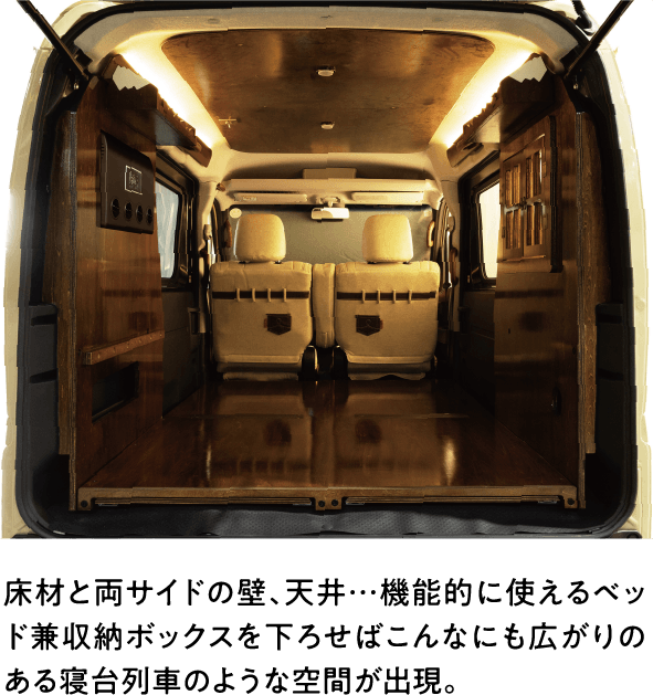 メニュー CAR INTERIOR200系ハイエースセンターコンソールボックスセカンドキャビネットベッドキットS-GLワゴンGLデッキカウンターS-GL標準ボディS-GLワイドボディ/ワゴンGLラゲッジテーブルシフトノブ/アシストグリップカーゴパネル/マットドアパネルダッシュマットランクル70センターコンソールボックスシートカバー内張りベッドキットアシストグリップ78プラドセンターコンソールボックスカーゴパネル内張りシートカバーTOWNACEシートカバーセンターコンソールボックスベッドキットカーゴパネル内張りアシストグリップドリンクホルダーサンバイザーカバーATRAIシートカバーカーゴキットリアゲートパネルアシストグリップコンプリートキットPROBOXシートカバーカーゴパネルサンシェードリアゲートパネルアシストグリップCARAVANシートカバーセンターコンソールボックスセカンドキャビネットベッドキットカーゴパネルアシストグリップNV200ドリンクホルダーJIMNYシートカバーセンターコンソールボックスドリンクホルダーアシストグリップCLIPPERSEAT COVER200系ハイエースS-GLワゴンGL軽自動車2列シート3列シートフロントのみBIKEシートカバー 実績に基づいた知見から 旅に適した軽バンをトータルデザイン。 私たち「軽バン生活」らしさを残しつつ さらにアップデートした室内装備に感動! 9つのパターンから選べる内装デザイン 車体本体価格 (消費税10%込)¥2,950,000~ COMPLETE CAR LINEUP メニュー CAR INTERIOR200系ハイエースセンターコンソールボックスセカンドキャビネットベッドキットS-GLワゴンGLデッキカウンターS-GL標準ボディS-GLワイドボディ/ワゴンGLラゲッジテーブルシフトノブ/アシストグリップカーゴパネル/マットドアパネルダッシュマットランクル70センターコンソールボックスシートカバー内張りベッドキットアシストグリップ78プラドセンターコンソールボックスカーゴパネル内張りシートカバーTOWNACEシートカバーセンターコンソールボックスベッドキットカーゴパネル内張りアシストグリップドリンクホルダーサンバイザーカバーATRAIシートカバーカーゴキットリアゲートパネルアシストグリップコンプリートキットPROBOXシートカバーカーゴパネルサンシェードリアゲートパネルアシストグリップCARAVANシートカバーセンターコンソールボックスセカンドキャビネットベッドキットカーゴパネルアシストグリップNV200ドリンクホルダーJIMNYシートカバーセンターコンソールボックスドリンクホルダーアシストグリップCLIPPERSEAT COVER200系ハイエースS-GLワゴンGL軽自動車2列シート3列シートフロントのみBIKEシートカバー 実績に基づいた知見から 旅に適した軽バンをトータルデザイン。 私たち「軽バン生活」らしさを残しつつ さらにアップデートした室内装備に感動! 9つのパターンから選べる内装デザイン 車体本体価格 (消費税10%込)¥2,950,000~ COMPLETE CAR LINEUP