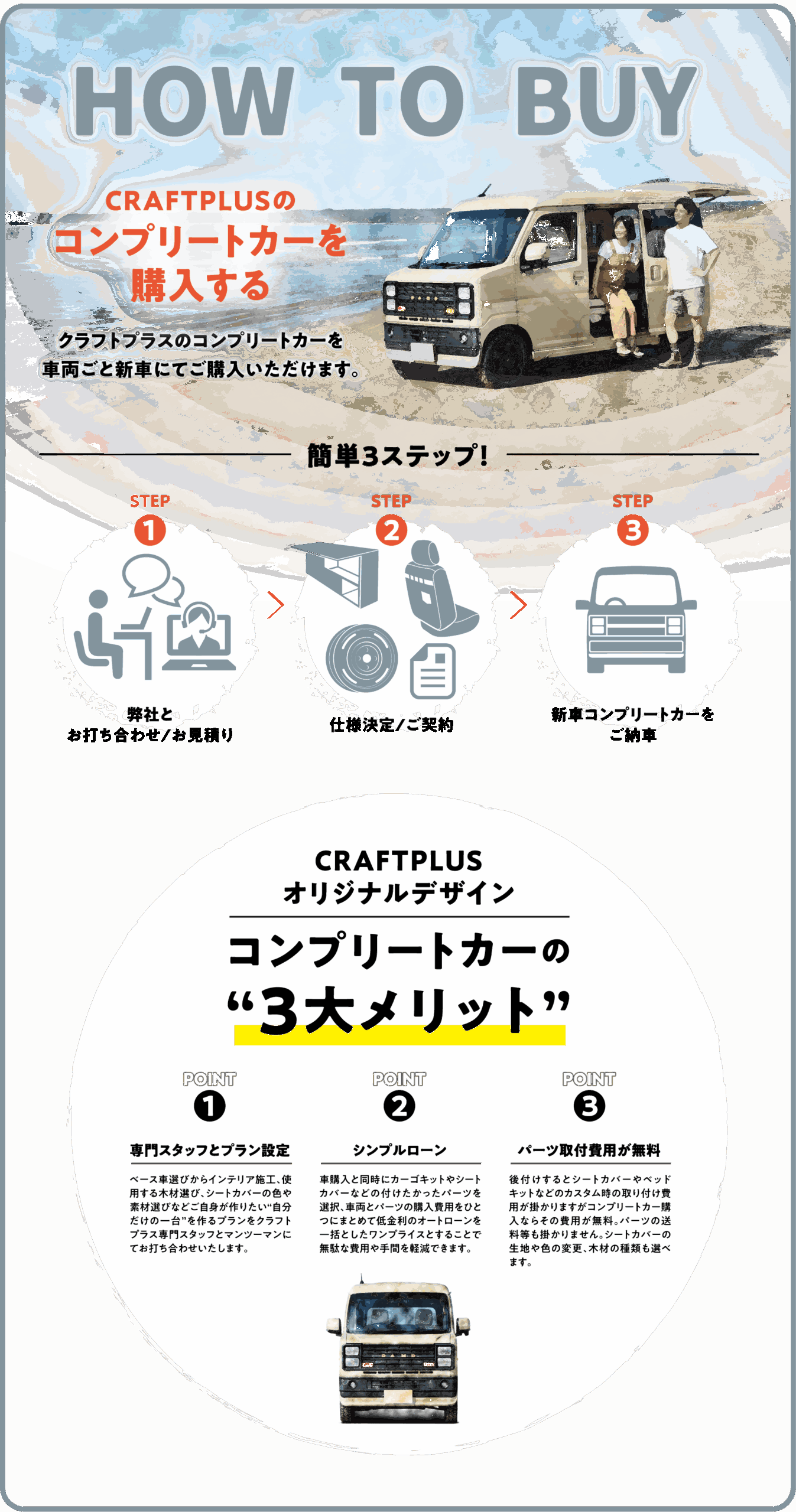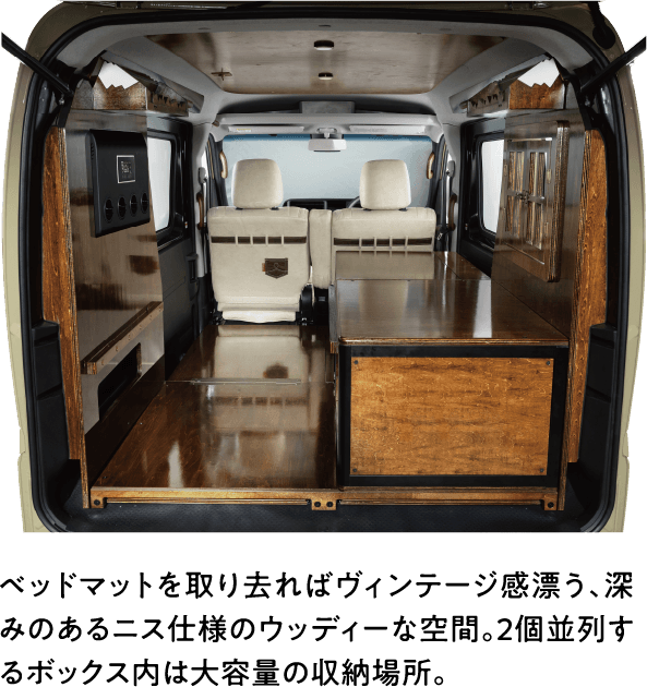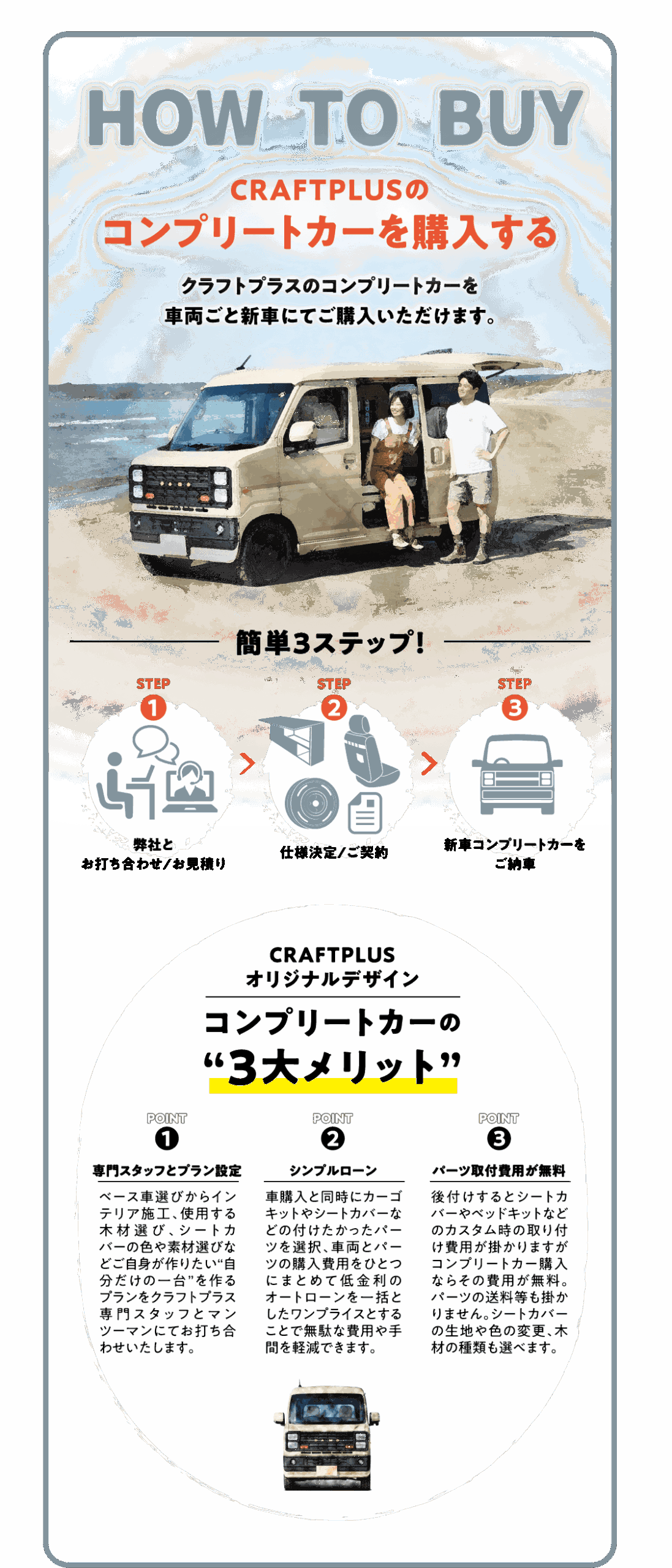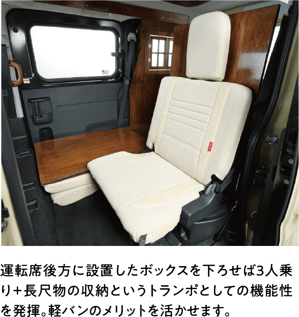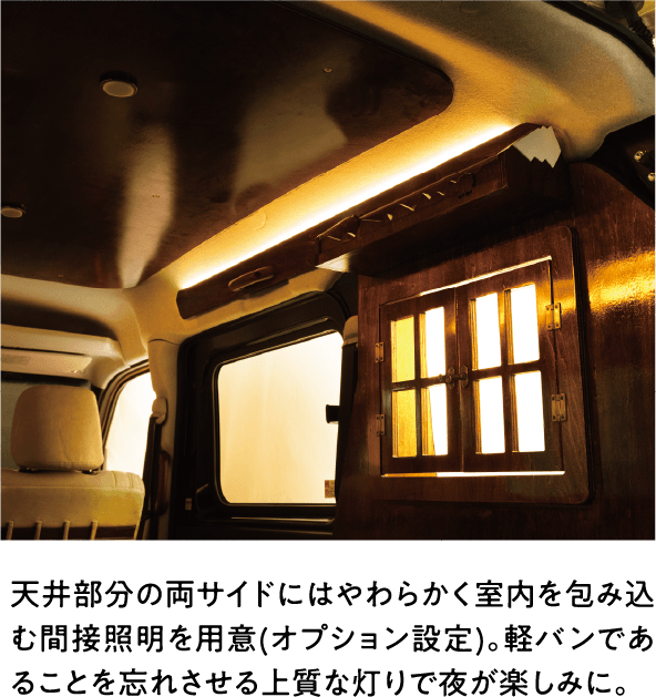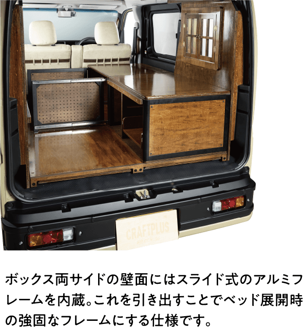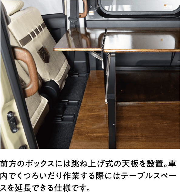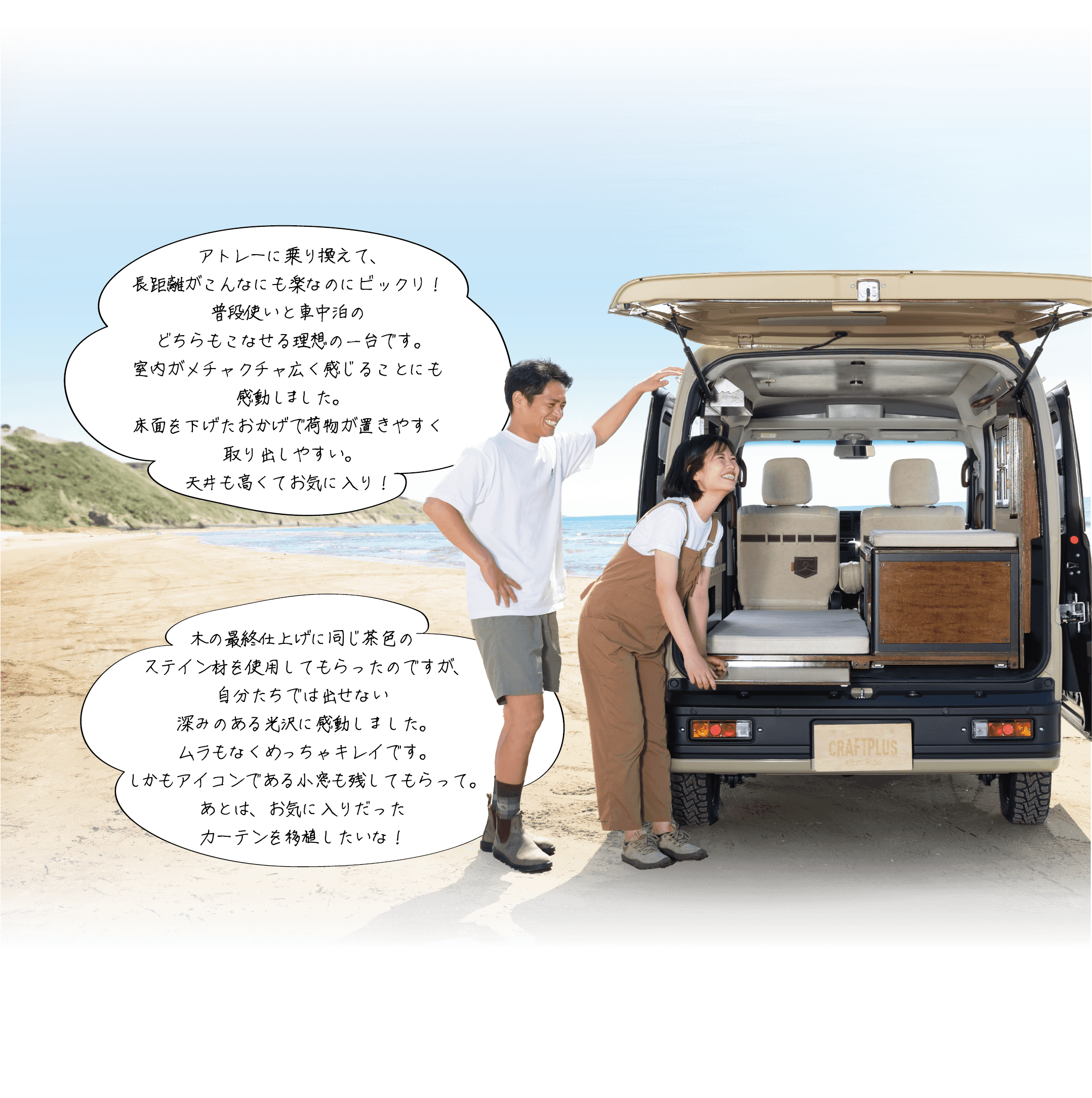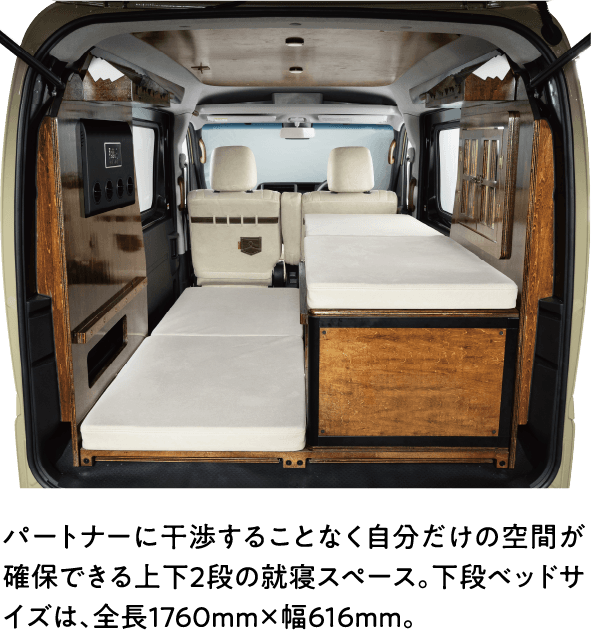 メニュー CAR INTERIOR200系ハイエースセンターコンソールボックスセカンドキャビネットベッドキットS-GLワゴンGLデッキカウンターS-GL標準ボディS-GLワイドボディ/ワゴンGLラゲッジテーブルシフトノブ/アシストグリップカーゴパネル/マットドアパネルダッシュマットランクル70センターコンソールボックスシートカバー内張りベッドキットアシストグリップ78プラドセンターコンソールボックスカーゴパネル内張りシートカバーTOWNACEシートカバーセンターコンソールボックスベッドキットカーゴパネル内張りアシストグリップドリンクホルダーサンバイザーカバーATRAIシートカバーカーゴキットリアゲートパネルアシストグリップコンプリートキットPROBOXシートカバーカーゴパネルサンシェードリアゲートパネルアシストグリップCARAVANシートカバーセンターコンソールボックスセカンドキャビネットベッドキットカーゴパネルアシストグリップNV200ドリンクホルダーJIMNYシートカバーセンターコンソールボックスドリンクホルダーアシストグリップCLIPPERSEAT COVER200系ハイエースS-GLワゴンGL軽自動車2列シート3列シートフロントのみBIKEシートカバー 実績に基づいた知見から 旅に適した軽バンをトータルデザイン。 私たち「軽バン生活」らしさを残しつつ さらにアップデートした室内装備に感動! 9つのパターンから選べる内装デザイン 車体本体価格 (消費税10%込)¥2,950,000~ COMPLETE CAR LINEUP メニュー CAR INTERIOR200系ハイエースセンターコンソールボックスセカンドキャビネットベッドキットS-GLワゴンGLデッキカウンターS-GL標準ボディS-GLワイドボディ/ワゴンGLラゲッジテーブルシフトノブ/アシストグリップカーゴパネル/マットドアパネルダッシュマットランクル70センターコンソールボックスシートカバー内張りベッドキットアシストグリップ78プラドセンターコンソールボックスカーゴパネル内張りシートカバーTOWNACEシートカバーセンターコンソールボックスベッドキットカーゴパネル内張りアシストグリップドリンクホルダーサンバイザーカバーATRAIシートカバーカーゴキットリアゲートパネルアシストグリップコンプリートキットPROBOXシートカバーカーゴパネルサンシェードリアゲートパネルアシストグリップCARAVANシートカバーセンターコンソールボックスセカンドキャビネットベッドキットカーゴパネルアシストグリップNV200ドリンクホルダーJIMNYシートカバーセンターコンソールボックスドリンクホルダーアシストグリップCLIPPERSEAT COVER200系ハイエースS-GLワゴンGL軽自動車2列シート3列シートフロントのみBIKEシートカバー 実績に基づいた知見から 旅に適した軽バンをトータルデザイン。 私たち「軽バン生活」らしさを残しつつ さらにアップデートした室内装備に感動! 9つのパターンから選べる内装デザイン 車体本体価格 (消費税10%込)¥2,950,000~ COMPLETE CAR LINEUP