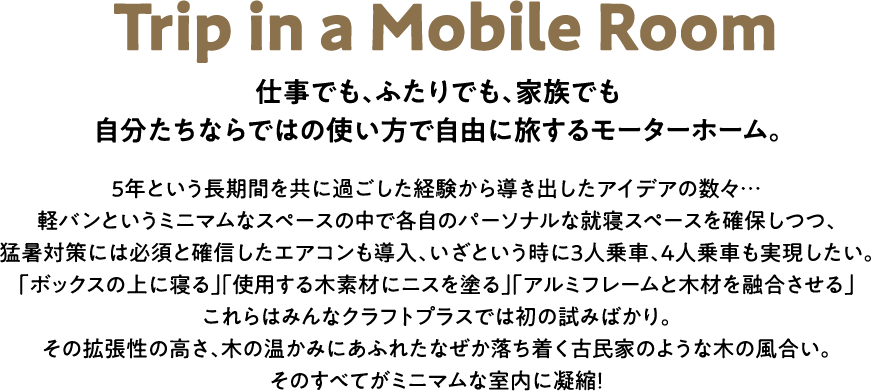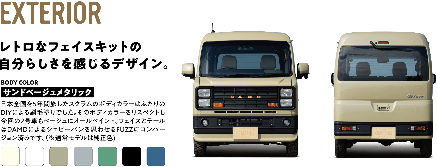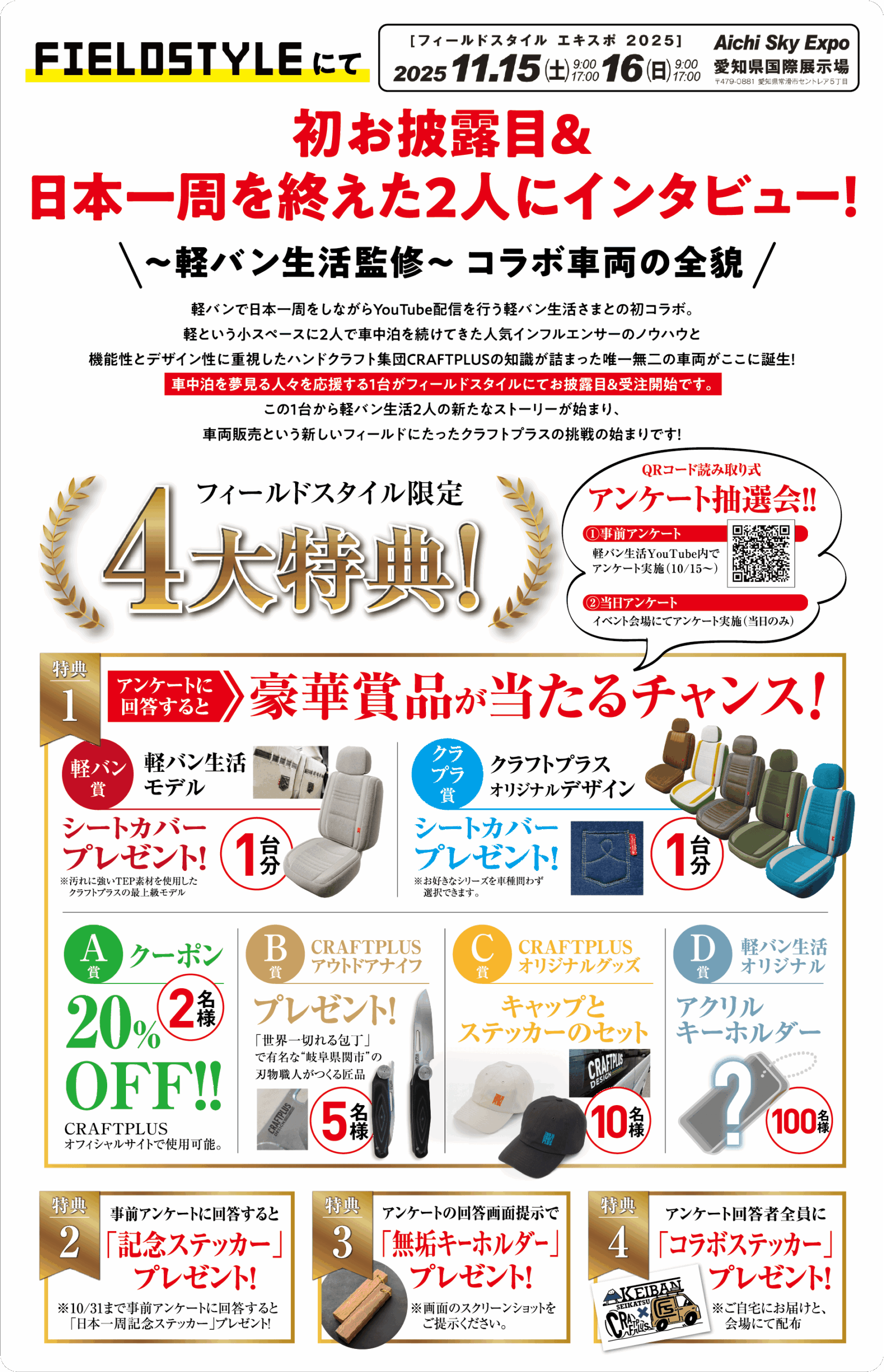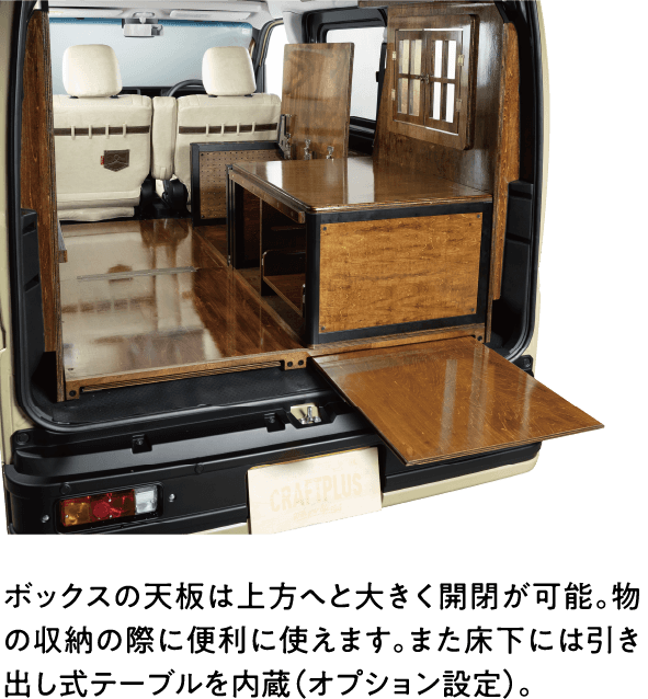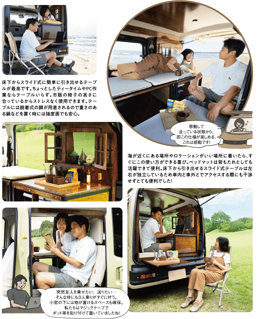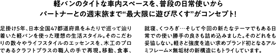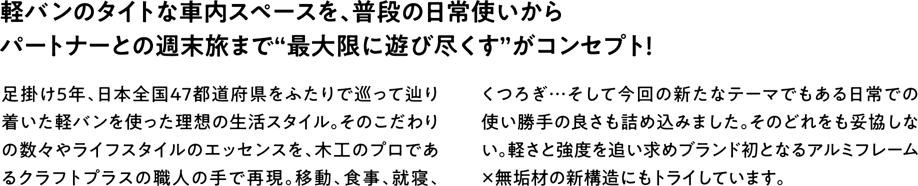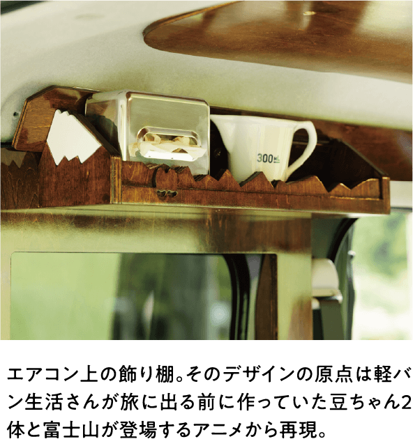 メニュー CAR INTERIOR200系ハイエースセンターコンソールボックスセカンドキャビネットベッドキットS-GLワゴンGLデッキカウンターS-GL標準ボディS-GLワイドボディ/ワゴンGLラゲッジテーブルシフトノブ/アシストグリップカーゴパネル/マットドアパネルダッシュマットランクル70センターコンソールボックスシートカバー内張りベッドキットアシストグリップ78プラドセンターコンソールボックスカーゴパネル内張りシートカバーTOWNACEシートカバーセンターコンソールボックスベッドキットカーゴパネル内張りアシストグリップドリンクホルダーサンバイザーカバーATRAIシートカバーカーゴキットリアゲートパネルアシストグリップコンプリートキットPROBOXシートカバーカーゴパネルサンシェードリアゲートパネルアシストグリップCARAVANシートカバーセンターコンソールボックスセカンドキャビネットベッドキットカーゴパネルアシストグリップNV200ドリンクホルダーJIMNYシートカバーセンターコンソールボックスドリンクホルダーアシストグリップCLIPPERSEAT COVER200系ハイエースS-GLワゴンGL軽自動車2列シート3列シートフロントのみBIKEシートカバー 実績に基づいた知見から 旅に適した軽バンをトータルデザイン。 私たち「軽バン生活」らしさを残しつつ さらにアップデートした室内装備に感動! 9つのパターンから選べる内装デザイン 車体本体価格 (消費税10%込)¥2,950,000~ COMPLETE CAR LINEUP メニュー CAR INTERIOR200系ハイエースセンターコンソールボックスセカンドキャビネットベッドキットS-GLワゴンGLデッキカウンターS-GL標準ボディS-GLワイドボディ/ワゴンGLラゲッジテーブルシフトノブ/アシストグリップカーゴパネル/マットドアパネルダッシュマットランクル70センターコンソールボックスシートカバー内張りベッドキットアシストグリップ78プラドセンターコンソールボックスカーゴパネル内張りシートカバーTOWNACEシートカバーセンターコンソールボックスベッドキットカーゴパネル内張りアシストグリップドリンクホルダーサンバイザーカバーATRAIシートカバーカーゴキットリアゲートパネルアシストグリップコンプリートキットPROBOXシートカバーカーゴパネルサンシェードリアゲートパネルアシストグリップCARAVANシートカバーセンターコンソールボックスセカンドキャビネットベッドキットカーゴパネルアシストグリップNV200ドリンクホルダーJIMNYシートカバーセンターコンソールボックスドリンクホルダーアシストグリップCLIPPERSEAT COVER200系ハイエースS-GLワゴンGL軽自動車2列シート3列シートフロントのみBIKEシートカバー 実績に基づいた知見から 旅に適した軽バンをトータルデザイン。 私たち「軽バン生活」らしさを残しつつ さらにアップデートした室内装備に感動! 9つのパターンから選べる内装デザイン 車体本体価格 (消費税10%込)¥2,950,000~ COMPLETE CAR LINEUP