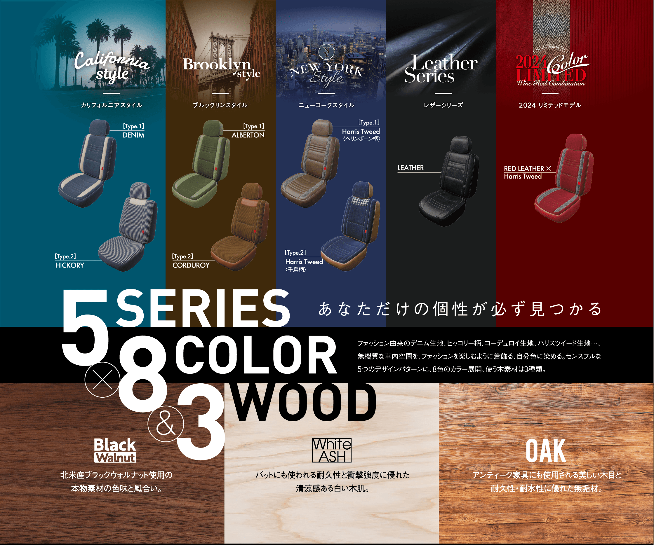 計300車種以上に対応する車種バリエーションも豊富なクラフトプラスのシートカバー。コーデュロイの生地にキャメルレザーがおしゃれなこのシートカバーはクラフトプラスのブルックリンスタイル・タイプ2。ボディ外観のレトロな雰囲気と非常にマッチします。もうひとつはアンティークなブラウンレザー×ハリスツイードが特徴的なニューヨークスタイル・タイプ1のシートカバーは首元部分の切り返しがカジュアルなヘリンボーン柄がアクセントになっているオシャレなデザイン。もちろんシート背面のベルトループやスマホが収まるポケットなど遊び心に溢れたアレンジ。