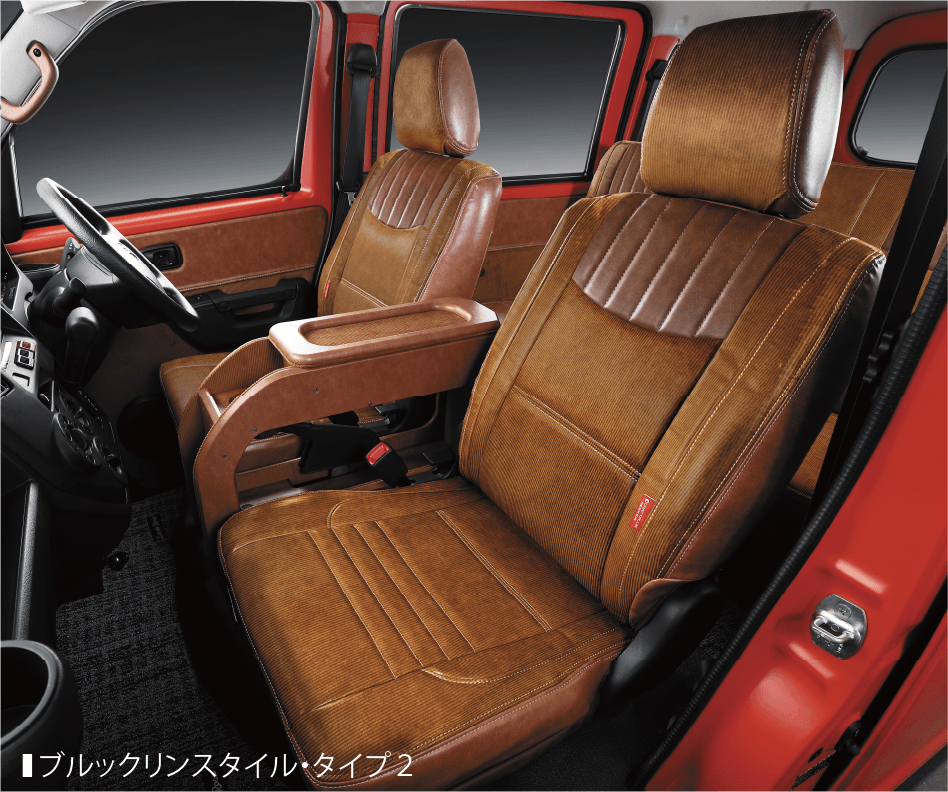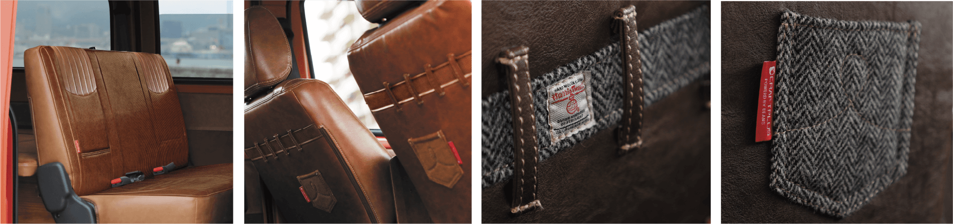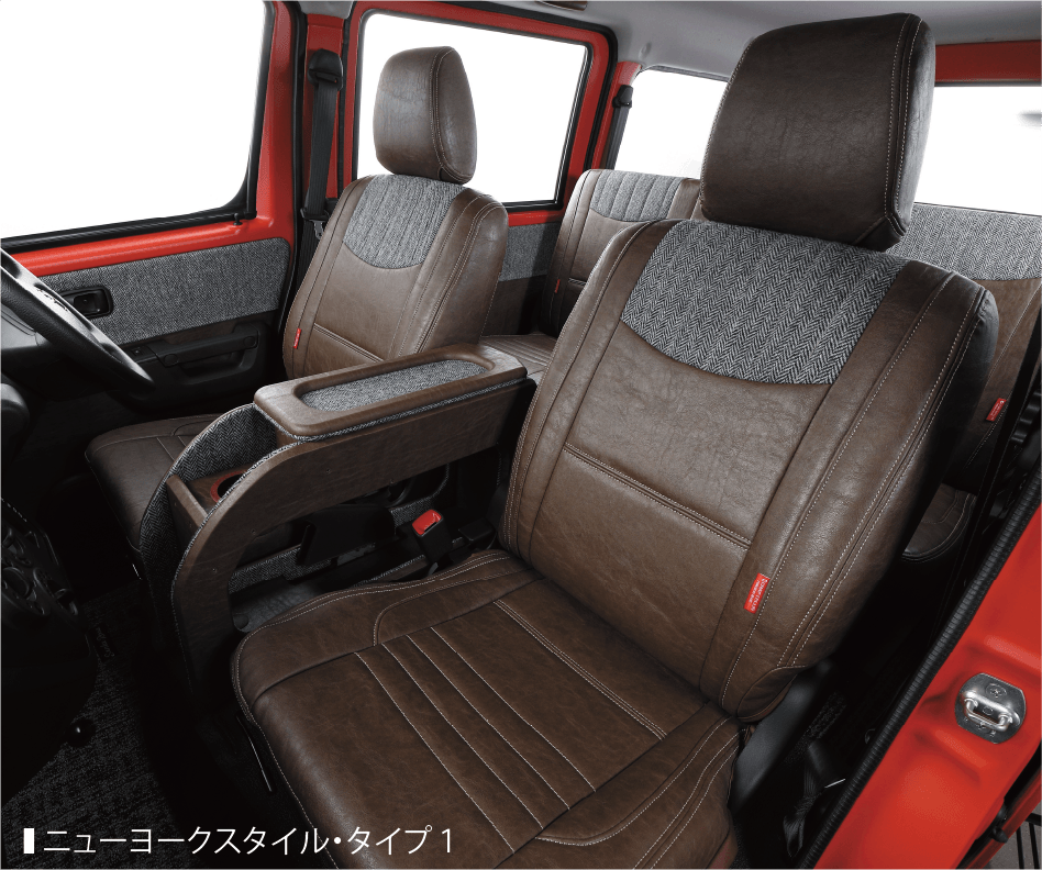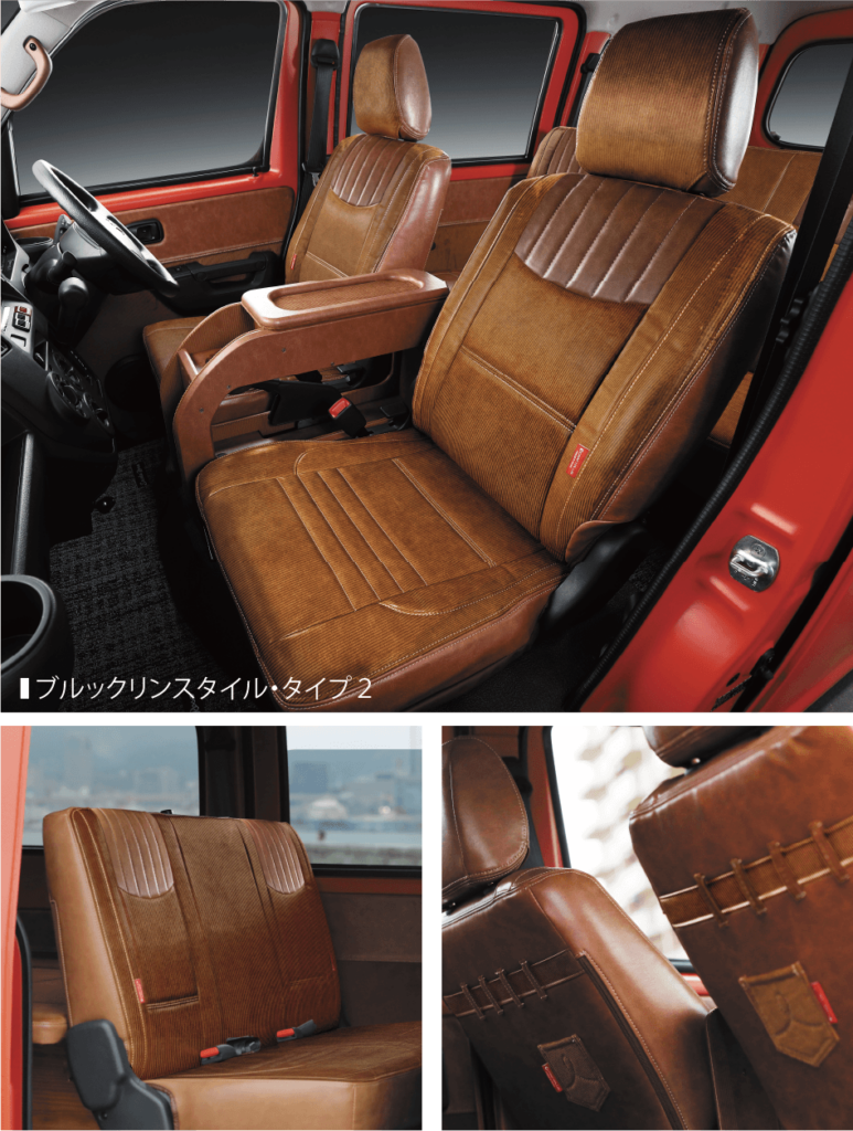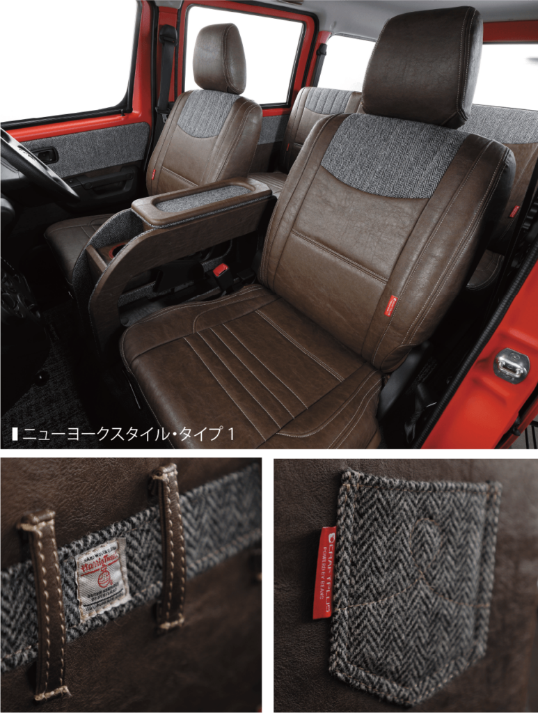 計300車種以上に対応する車種バリエーションも豊富なクラフトプラスのシートカバー。コーデュロイの生地にキャメルレザーがおしゃれなこのシートカバーはクラフトプラスのブルックリンスタイル・タイプ2。ボディ外観のレトロな雰囲気と非常によくマッチします。もうひとつはアンティークなブラウンレザー×ハリスツイードが特徴的なニューヨークスタイル・タイプ1のシートカバーは首元部分の切り返しがカジュアルなヘリンボーン柄がアクセントになっているオシャレなデザイン。もちろんシート背面のベルトループやスマホが収まるポケットなど遊び心に溢れたアレンジが効いているのも魅力です。