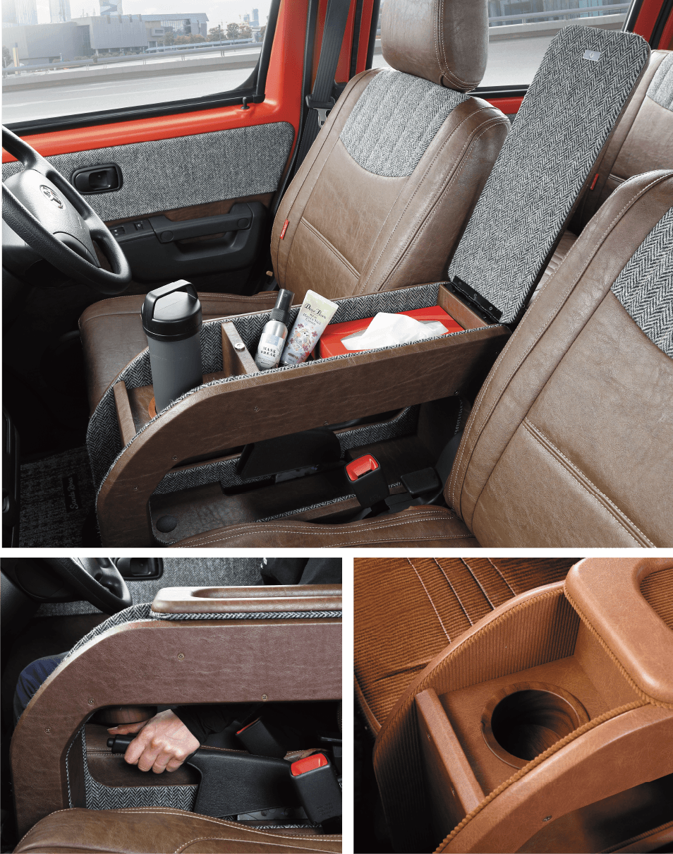 小物や肘が置けて便利な上にサイドブレーキ操作という純正の重要機能をスポイルすることなく快適性能だけをアップさせた運転する人の気持ちに寄り添った、使い勝手のいいギミック多数のセンターコンソール。取り付け方は純正のセンターコンソールを外して取り付けるというシンプルかつ簡単なもの。「肘を置く場所が無い」、「ドリンクホルダーの高さが無く置いたドリンクが安定しない」などの声に対応しました。開閉式の天板の下は収納スペースとなっており、ちょっとした小物をスッキリと収納しておくことが可能です。もちろん見た目のコクピット感が高まったことは最大のトピックです。