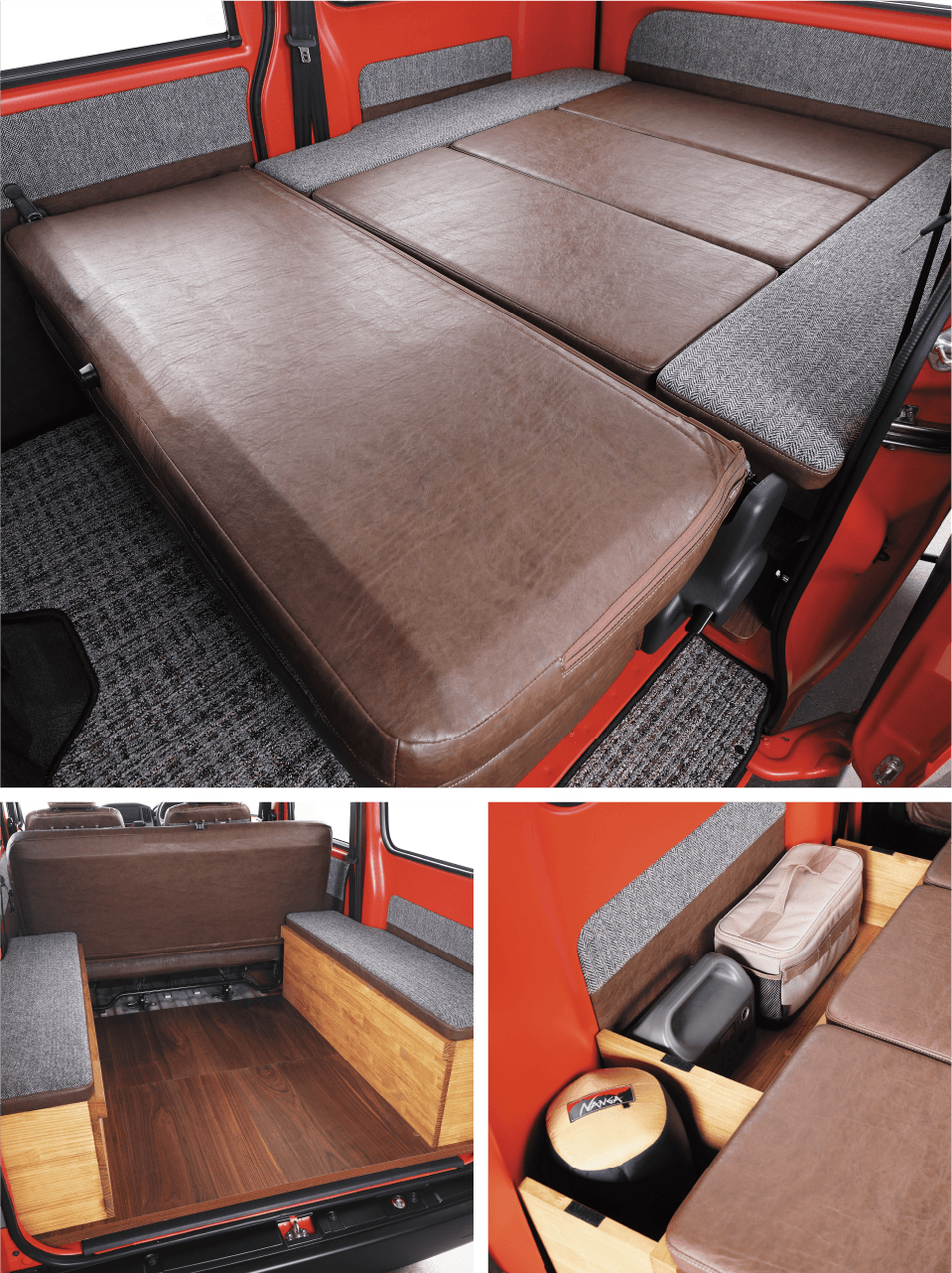 今や車中泊は車内での過ごし方ナンバー1とも呼べる人気の遊び方。そんな時にぜひ使っていただきたいのがこのベッドキット。横置きに展開するセンターマットが3枚と左右のキャビネット上に各1枚ずつの計5枚構成。両サイドのキャビネットの中は収納スペースにもなっていて非常にムダがありません。さらに2列目の純正シートを前へと倒した際にベッドマットとフラットになるように高さを設計しているため車内のベッドスペースは広々。大人2名がゆったりと就寝可能なスペースが確保できます。もちろんベッドマットの下は大容量の収納スペースとなるためシュラフや毛布、ポータブル電源など、遊びのキャンプギアも多数収納できます。