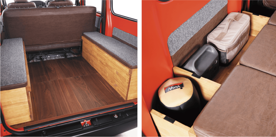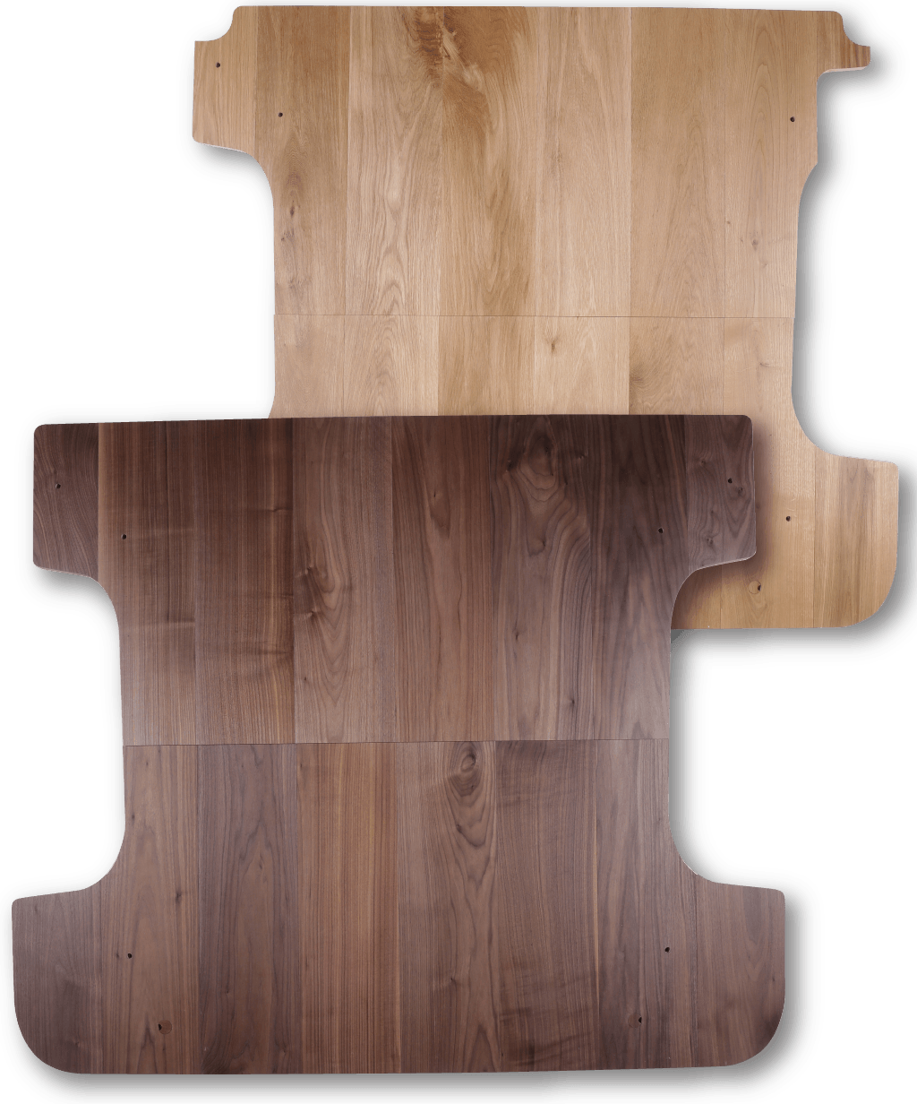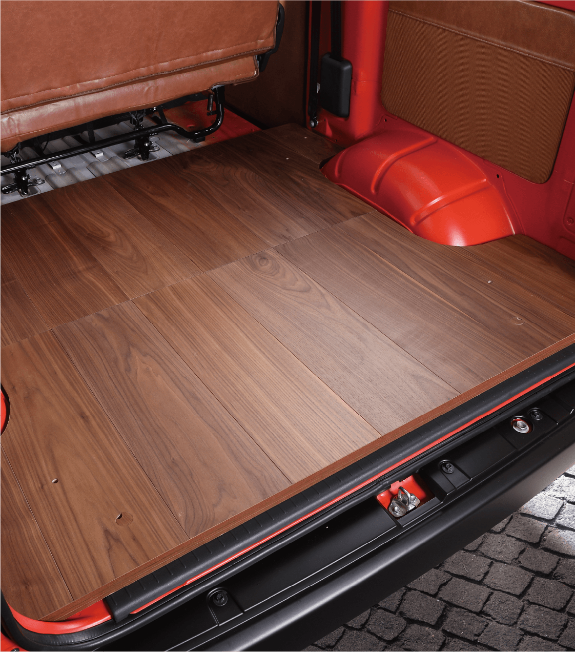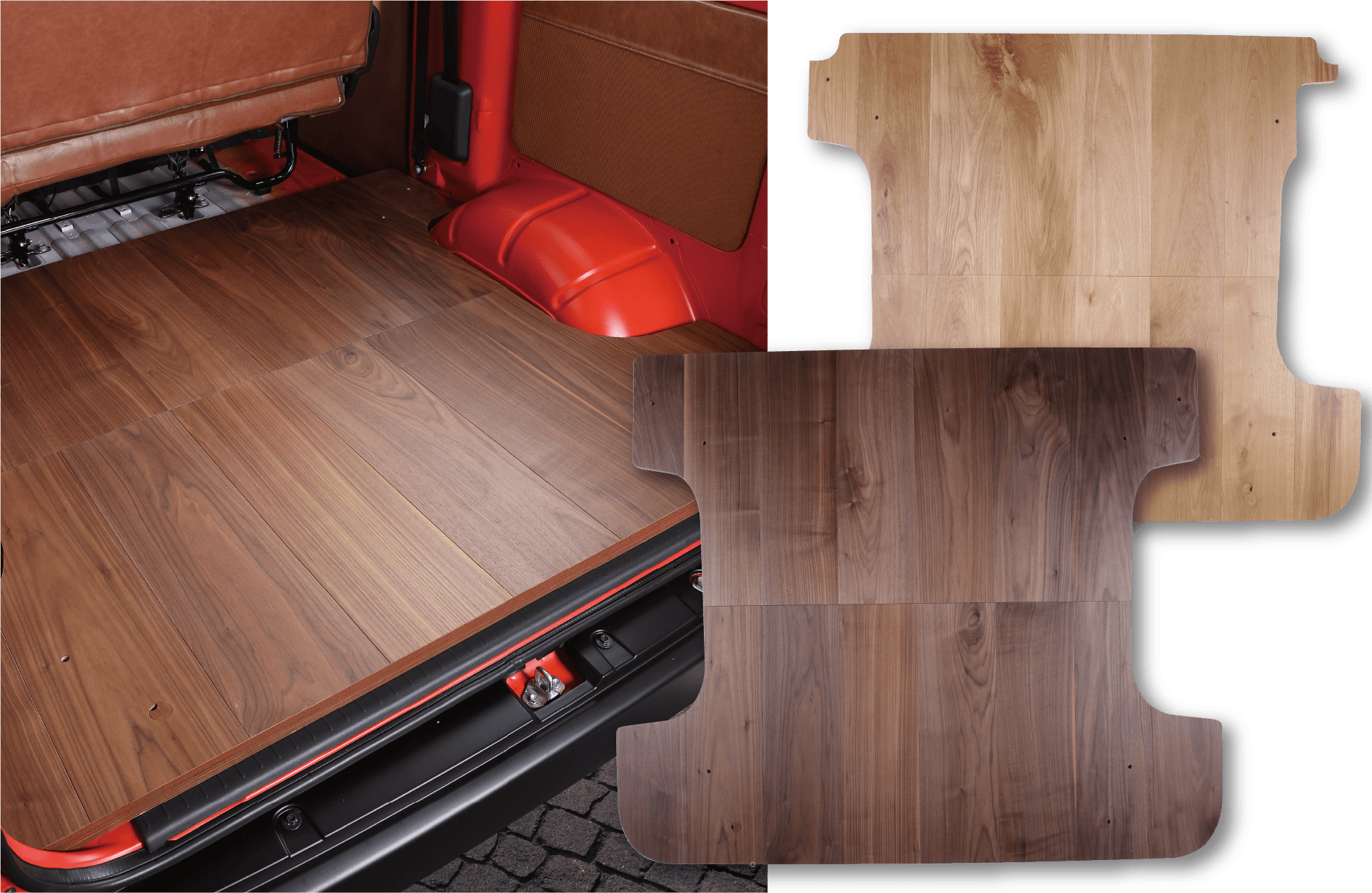 夫婦ふたりで…、一人で趣味のギアを積んで…、さらにはペットを連れての移動も快適に過ごす…など、ジャストサイズな楽しみ方ができるタウンエース。そんな相棒には木のぬくもりを感じさせる床パネルがオススメです。板材にはアメリカの住宅用資材として流通する190mmという大きな幅の板を用意しました。幅が広くなった分、つなぎ目を最小にすることで、より一枚板のイメージに近づけました。パネルは2枚構成で設計、オスとメスのホゾで連結するためズレる心配もありません。このあたりも家具職人のこだわり。機能一辺倒だったバンならではの純正のカーペットから見た目がガラリと変身、室内がこだわりの趣味の空間へと変わります。
