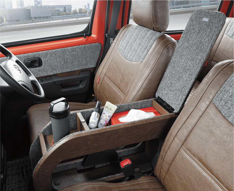 小物や肘が置けて便利な上にサイドブレーキ操作という純正の重要機能をスポイルすることなく快適性能だけをアップさせた運転する人の気持ちに寄り添った、使い勝手のいいギミック多数のセンターコンソール。取り付け方は純正のセンターコンソールを外して取り付けるというシンプルかつ簡単なもの。「肘を置く場所がない」、「ドリンクホルダーの高さが無く置いたドリンクが安定しない」などの声に対応しました。開閉式の天板の下は収納スペースとなっており、ちょっとした小物をスッキリと収納しておくことが可能です。もちろん見た目のコクピット感が高まったことは最大のトピック。バンの商用感が乗用車ライクに高まりました。