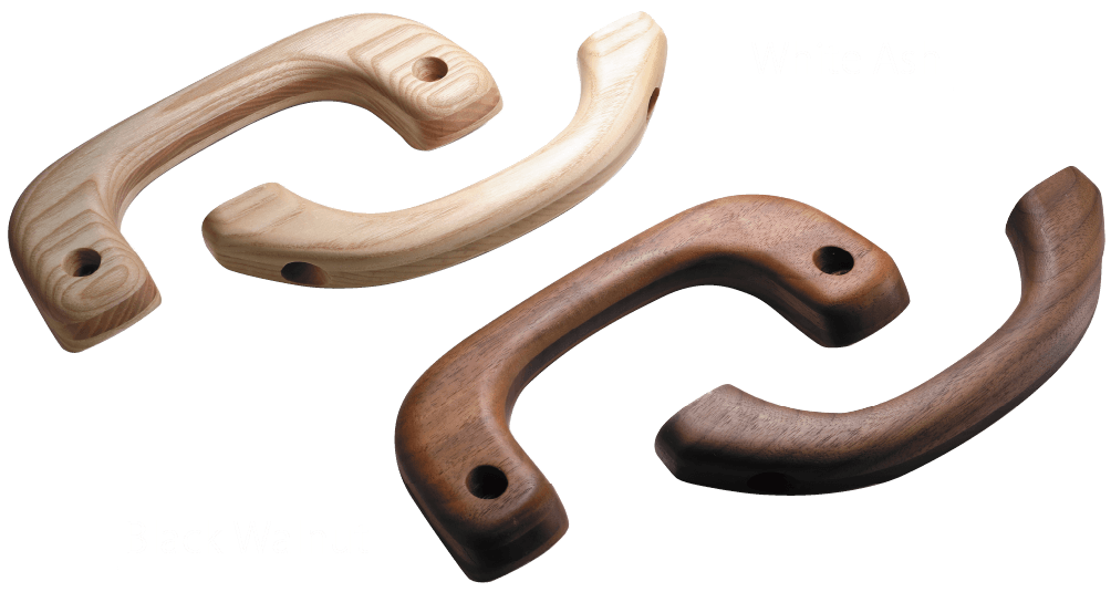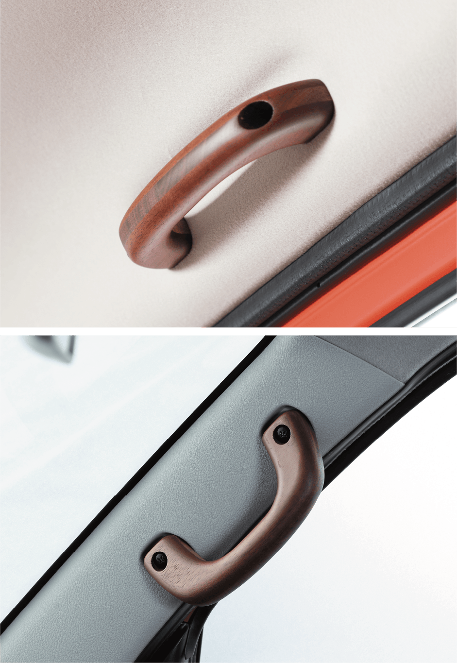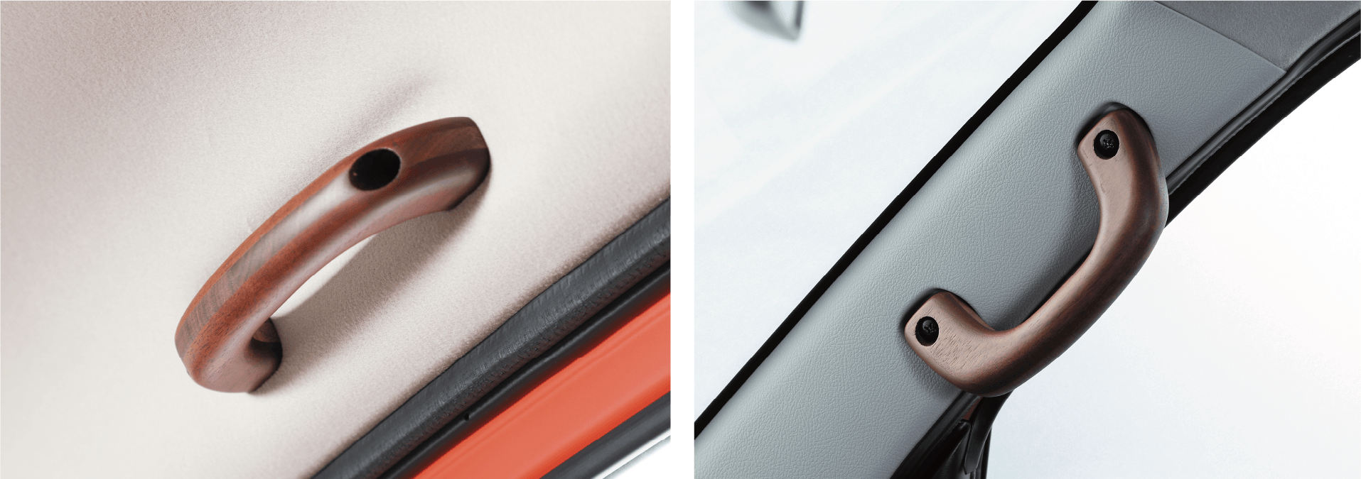 車内と車外への出入りの際に常に身体を支えるなど、手が触れる機会が多い車内パーツの筆頭=アシストグリップ。乗り降りの際に必ず触れるものだからこそ、このサラッとした握り心地やスベスベとした木肌のキメ細かさは、触れるたびにシックリくるもの。木が呼吸することや強度まで考えて職人がひとつひとつ木素材を張り合わせ、削り込み、磨き、徹底して握り心地にこだわったクラフトプラス渾身の木製パーツです。Aピラーの左右に2箇所、1列目シート上部左右に2箇所、2列目シート上部左右に2箇所の計6箇所に設置が可能。カラーは木肌の白いホワイトアッシュと、重厚さが楽しめるブラックウォールナットの2種類を用意しました。