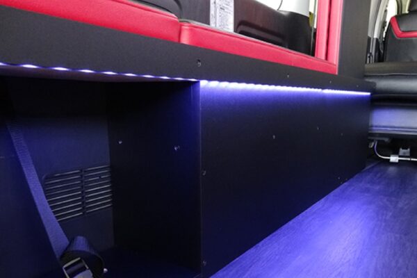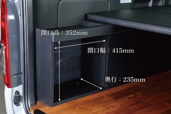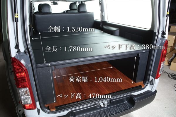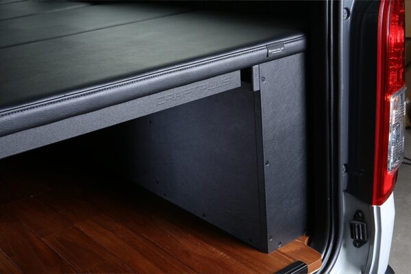 シンプルに4枚のベッドマットだけで構成した「CP400ベッドキット」。 ベッドとしての堅牢さを追求し極上の寝心地を実現したモデルです。ベッドマットを支えるキャビネットはブラックレザー仕上げ。 キャビネットの上面には収納スペースを用意し、後端にはポリタンクを置けるスペース(ベルト付き)も確保。 リアシートの背もたれを倒しただけで大人2人が横になれる広々としたフラットスペースを確保。 車中泊や移動時の仮眠などにも便利です。