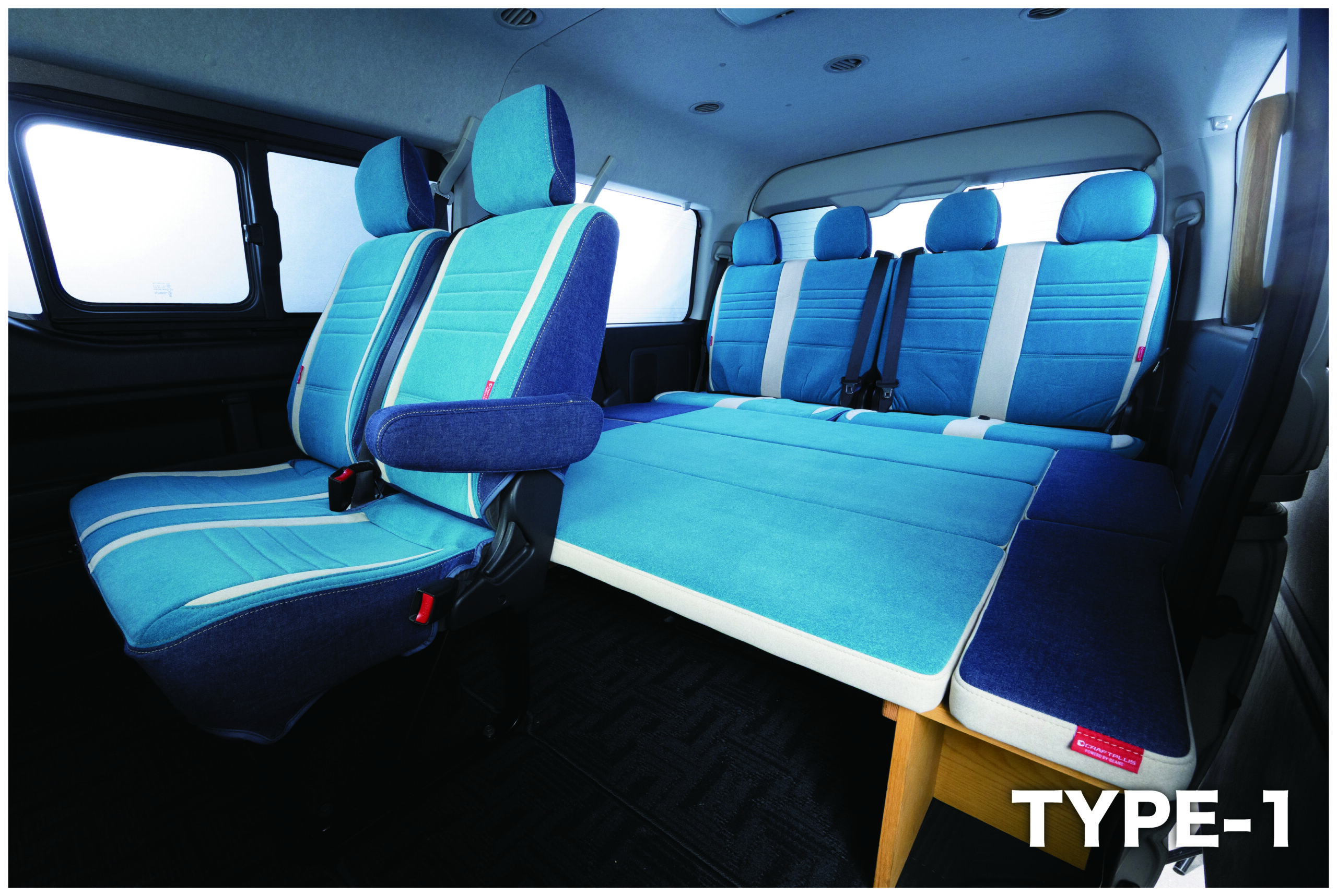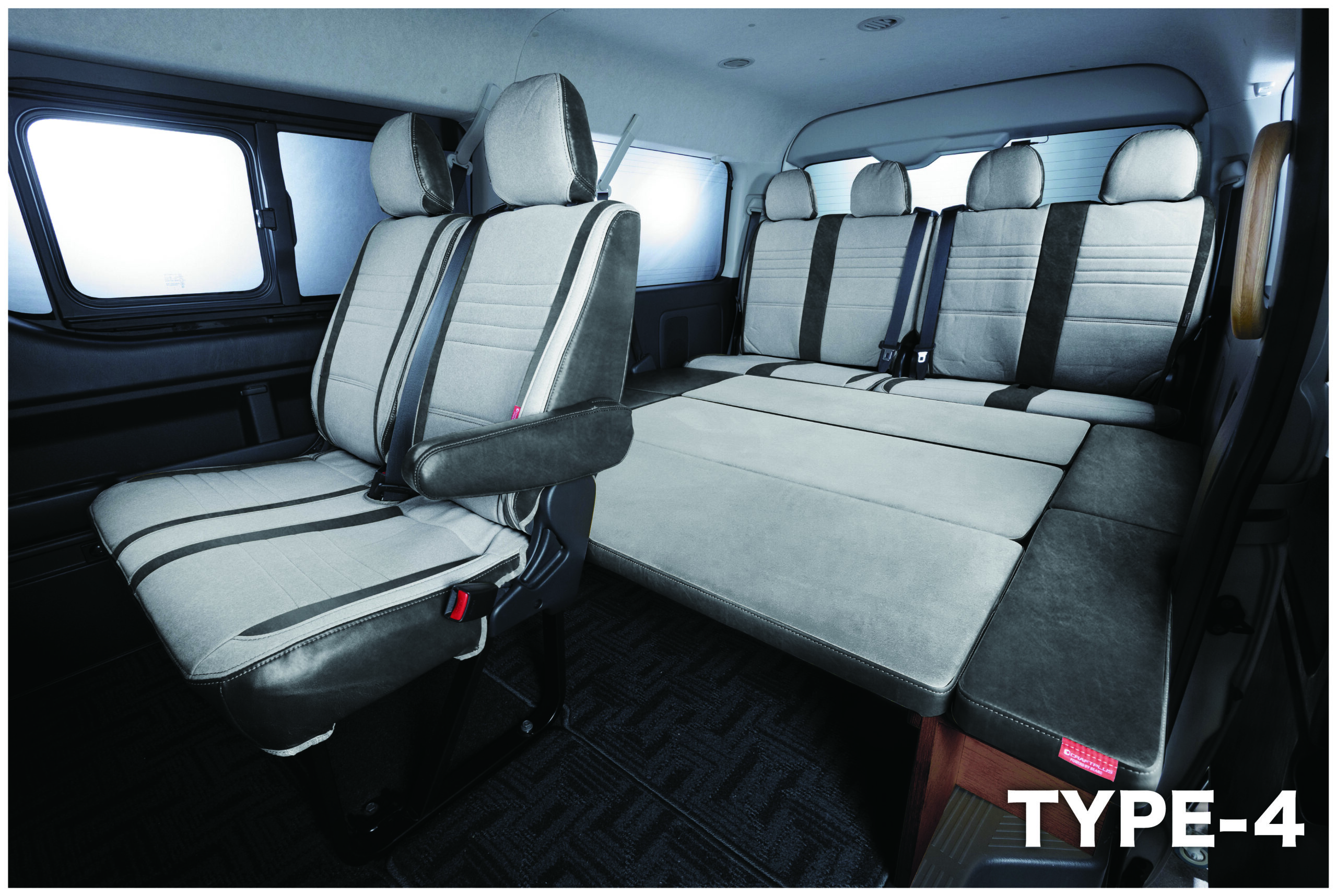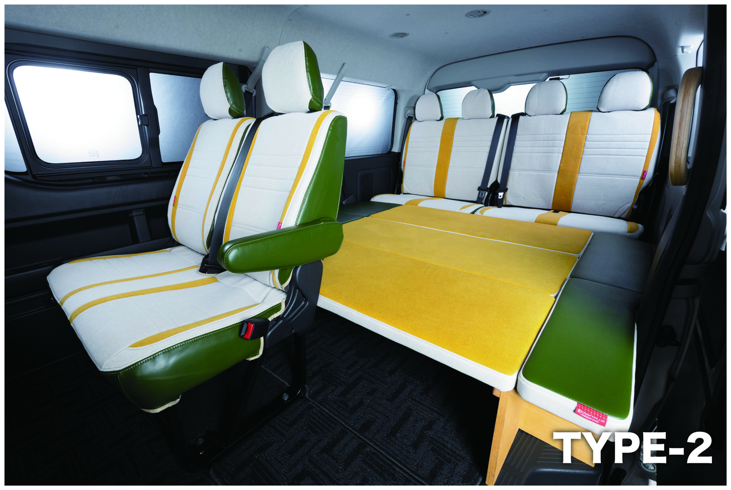 ワゴンGLの室内を格段に使いやすく変身させる「CP700ベッドキット」。乗車定員の10名はそのままキープしつう、3列目シートを横座りの2人掛けベンチシートに変更することで広々としたフラットスペースが出現します。