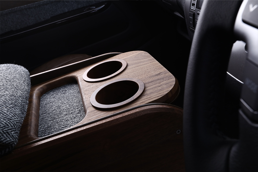 低いポジションに備えられた純正コンソール。肘を置くと、必然的にカラダが斜めになってしまう…。そこで、アームレストのポジションを適正な位置に修正。ドライバーのみならず、助手席に座る方も使えるように仕立てました。