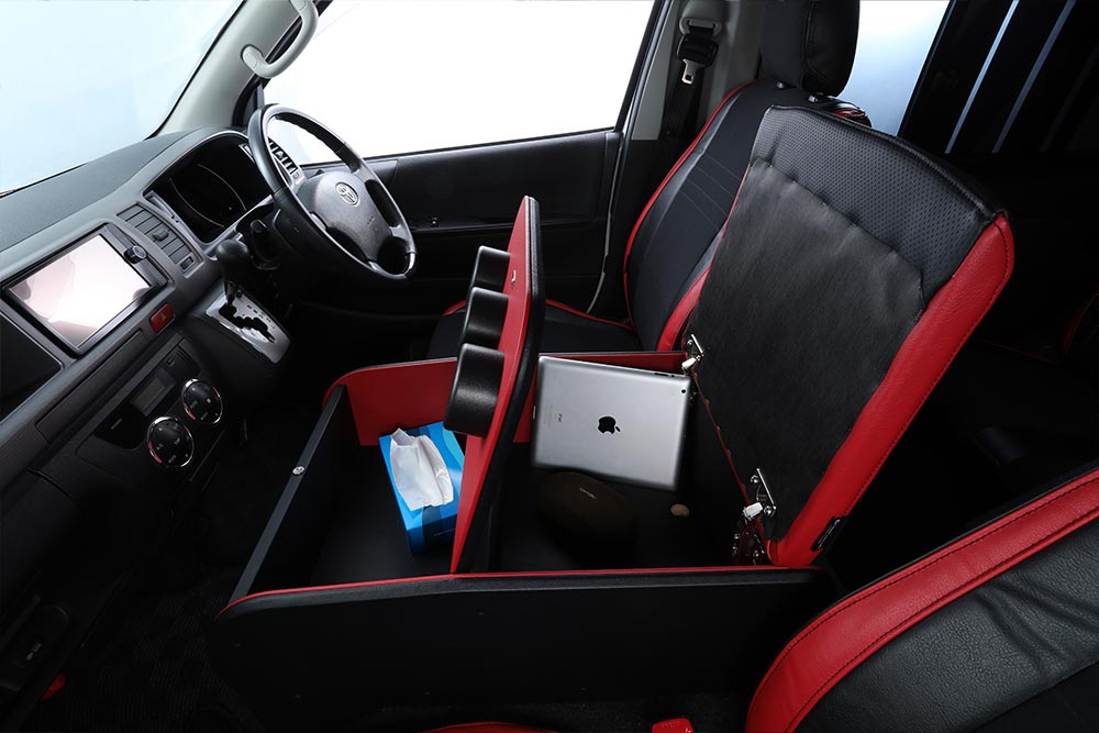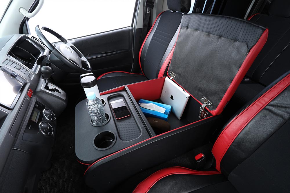 純正コンソールでは、運転席&助手席まわりをスッキリするには物足りない容量だった…。そこで大容量の収納ボックスを用意しました。アームレストを開けると、縦295mm×横255mm×高さ170mm。ジュースホルダーを開けると、縦237mm×横255mm×高さ170mmという十分な容量のボックスを備えています。
