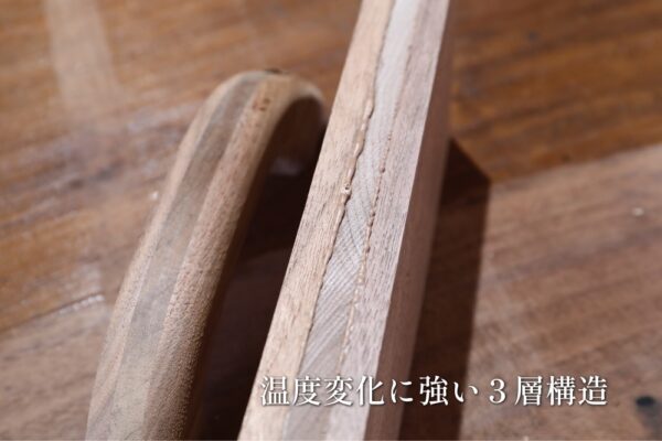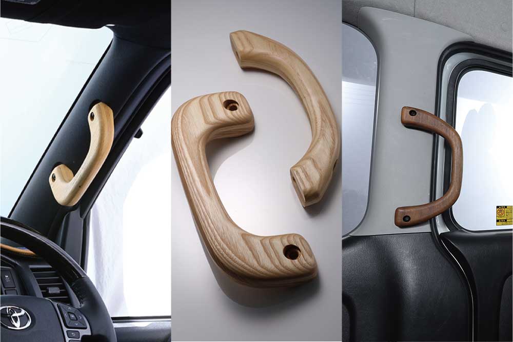 木は呼吸をします。車内は温度変化のすごい場所。だからこそ最悪の場合、割れてしまう恐れがある。 そんなことも考慮してクラフトプラスのアシストグリップは縦と横の木目を違い違いにした3層の木素材の組み合わせの塊から 削り出すことで、最大の強度を保っています。