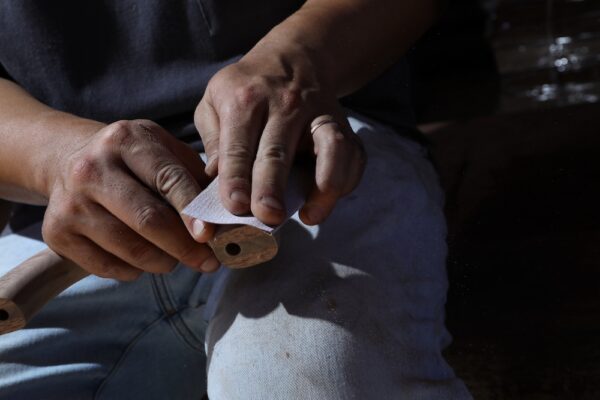 サンドペーパーと塗装、その仕上げ作業に5工程もの細かなステップを踏む。職人にしか分からない 微細な形状の違いを感じ取ってまた修正。カタチにもこだわり、徹底的に磨き込む。 木の調達からはじめて約半年がかり。ようやく製品として出荷されます。