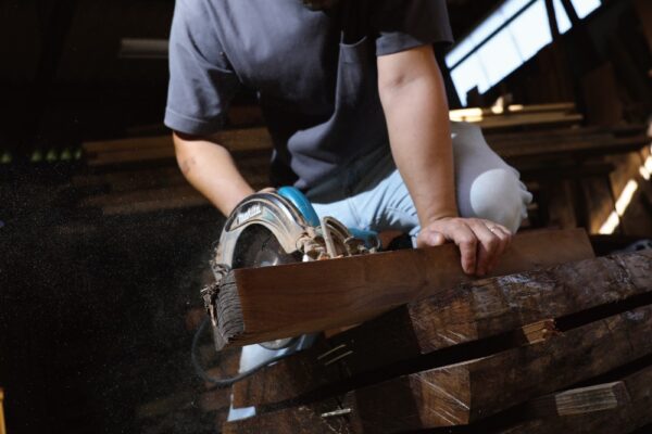 貴重なウォールナットを巨木の状態で仕入れる。世界的な木材不足もあり、この調達作業がまずは困難を極めます。 貴重な天然のこの2つの木材を岐阜の木材市場で仕入れ、天然乾燥、機械乾燥を繰り返し木の収縮を極限まで抑える。 日本の風土に馴染むよう管理・保管された一流品です。