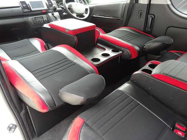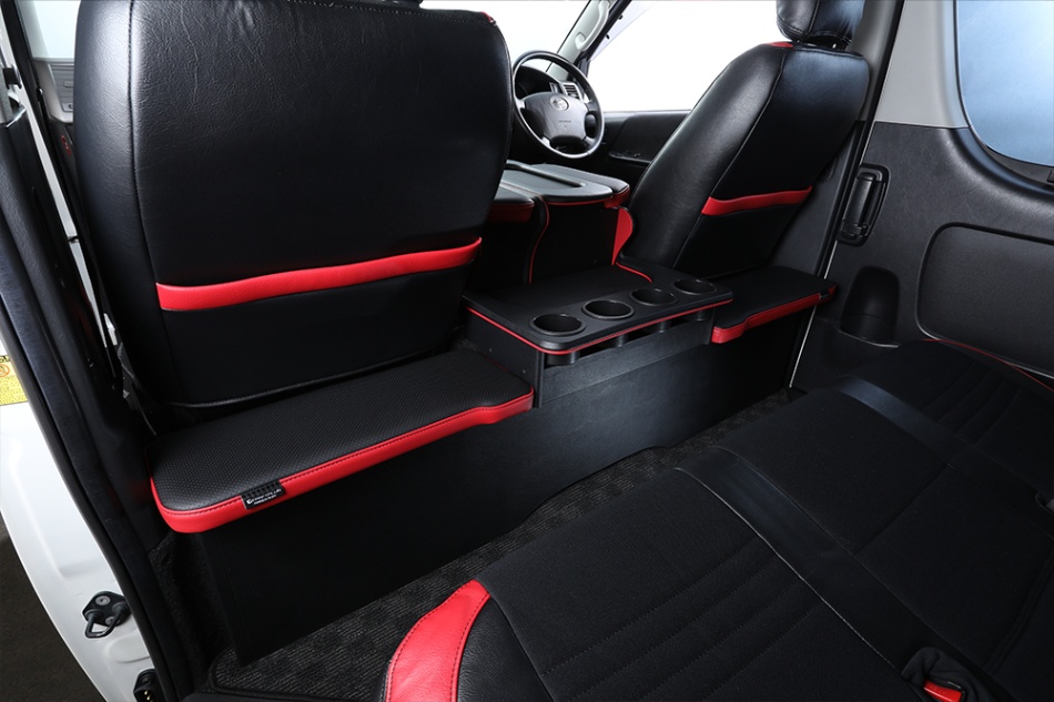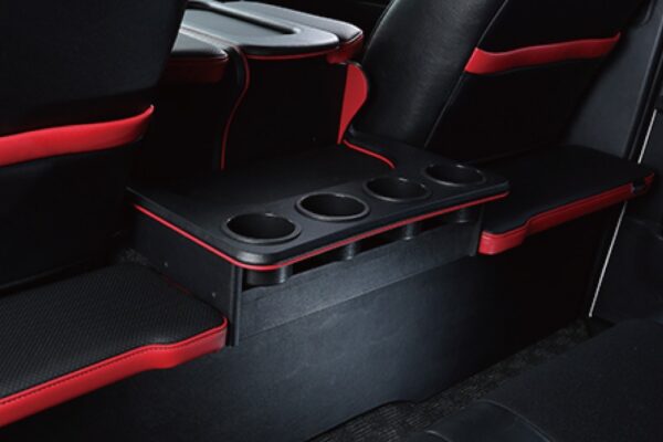 純正コンソール後ろにあるジュースホルダーは、リアシートからの距離があって、腰を浮かさなければ取り出せず、使い勝手がよくありませんでした。 それに対しセカンドキャビネットは、ジュースホルダーをリアシートに近い場所に配置。 この位置ならば、腰を浮かさずに取り出すことができます。 ジュースホルダーは、標準ボディ用で3個、ワイドボディ用ならば4個用意。