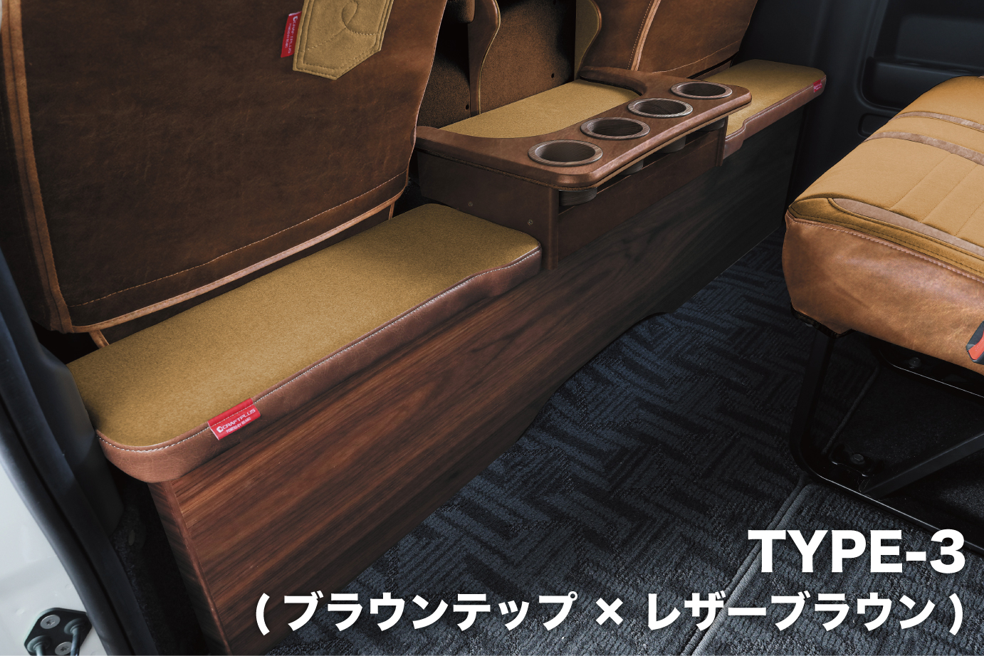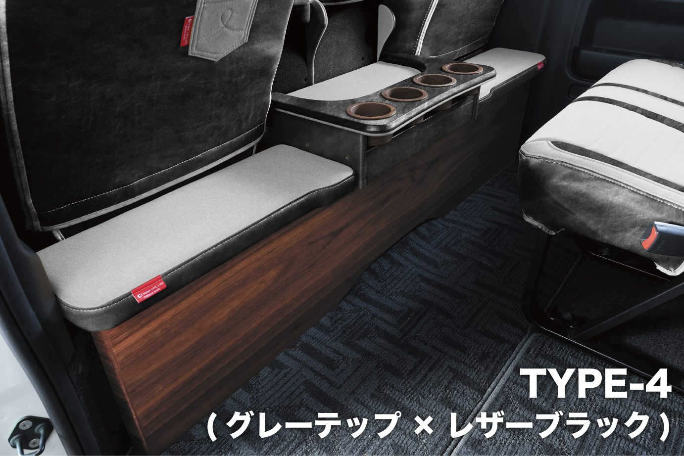 純正コンソール後ろにあるジュースホルダーは、リアシートからの距離があって、腰を浮かさなければ取り出せず、使い勝手がよくありませんでした。 それに対しセカンドキャビネットは、ジュースホルダーをリアシートに近い場所に配置。 この位置ならば、腰を浮かさずに取り出すことができます。 ジュースホルダーは、標準ボディ用で3個、ワイドボディ用ならば4個用意。