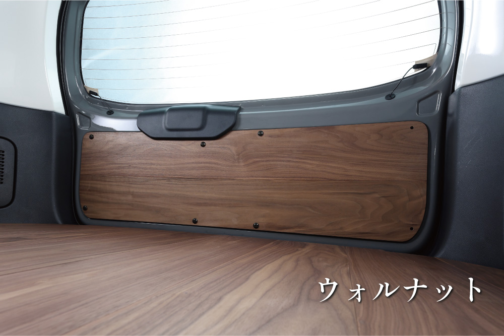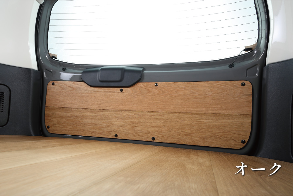 フロアパネル、サンシェードと荷室空間を演出したら、やはりリヤゲート裏もウッディーに演出したいもの。