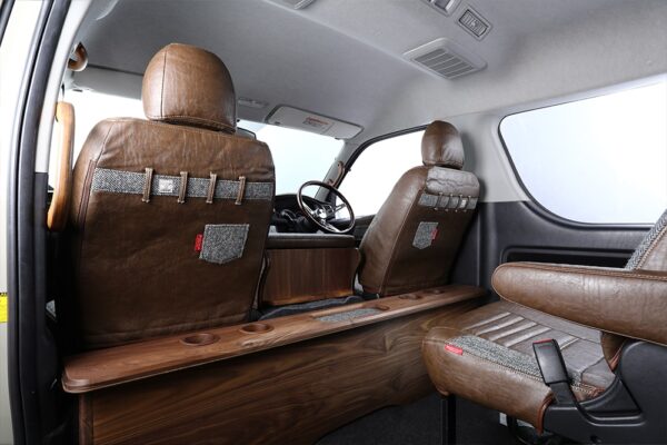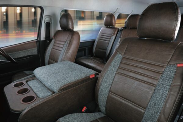 「ハリスツイード」生地を使用したこちらは”ヘリンボーン(白×黒)”のタイプ1。CaliforniaともBrooklynとも違う、ハイグレードな最新モデル。 アッパーなクラス感の欧州高級車や高級大型SUVの空気感を纏い、よりハイクラスな内装デザインへと見違えるように開発しました。