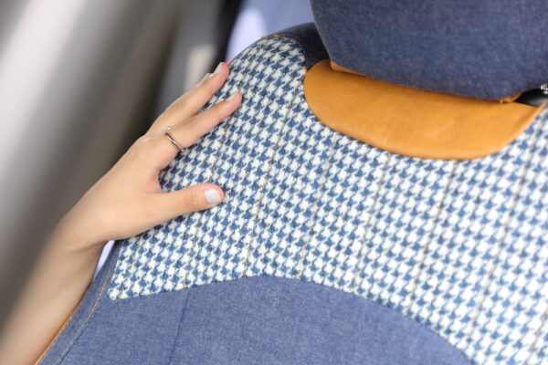 「ハリスツイード」生地を使用したこちらは”千鳥柄(白×青)”のタイプ2。CaliforniaともBrooklynとも違う、ハイグレードな最新モデル。 アッパーなクラス感の欧州高級車や高級大型SUVの空気感を纏い、よりハイクラスな内装デザインへと見違えるように開発しました。