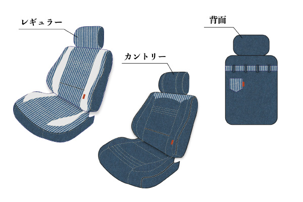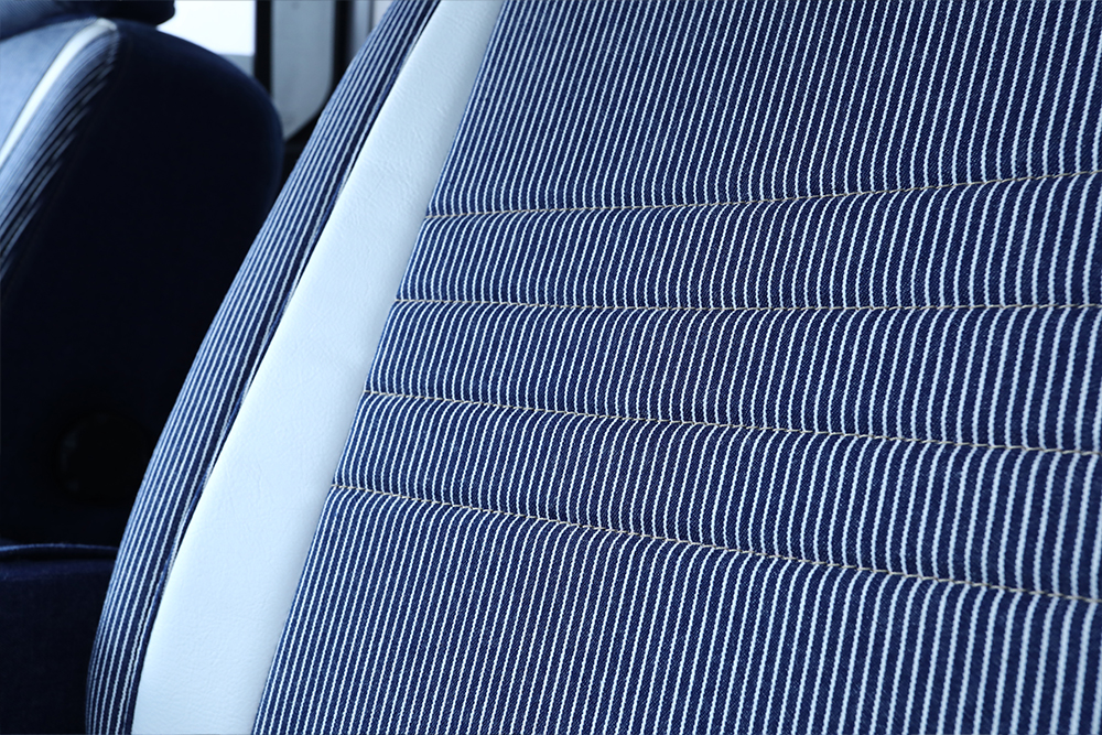 愛らしい縦縞ストライプが特徴の「ヒッコリー」。紺地に白の線が入った縞模様のデニム生地。汚れが目立たないようにとの配慮からこの縞模様が開発された歴史もあるだけに、 小さなお子様の乗車からハードなワークにも耐えられる実用性があります。