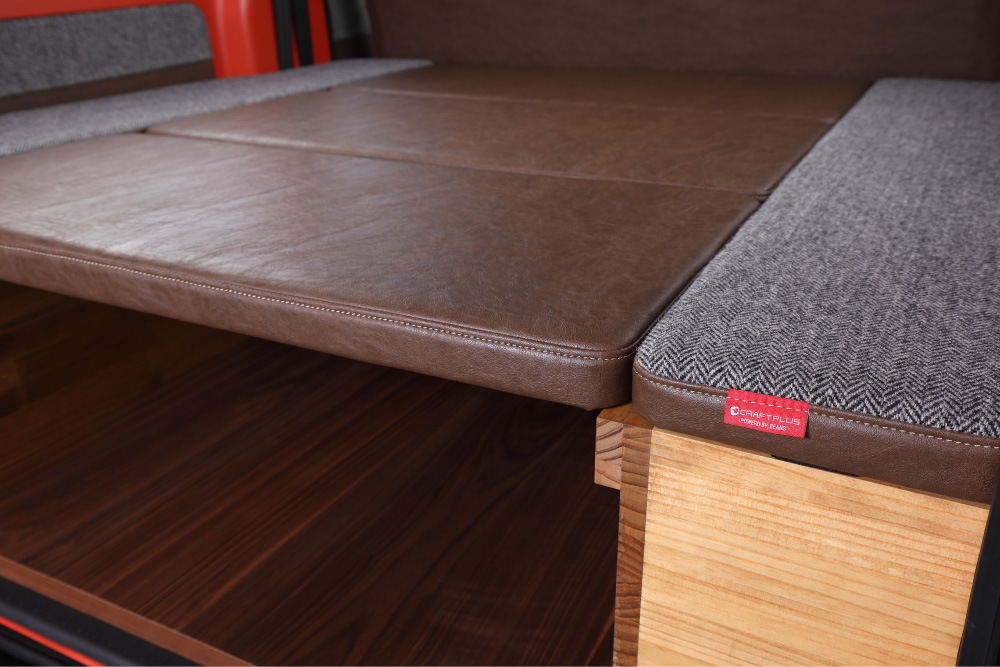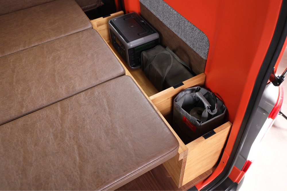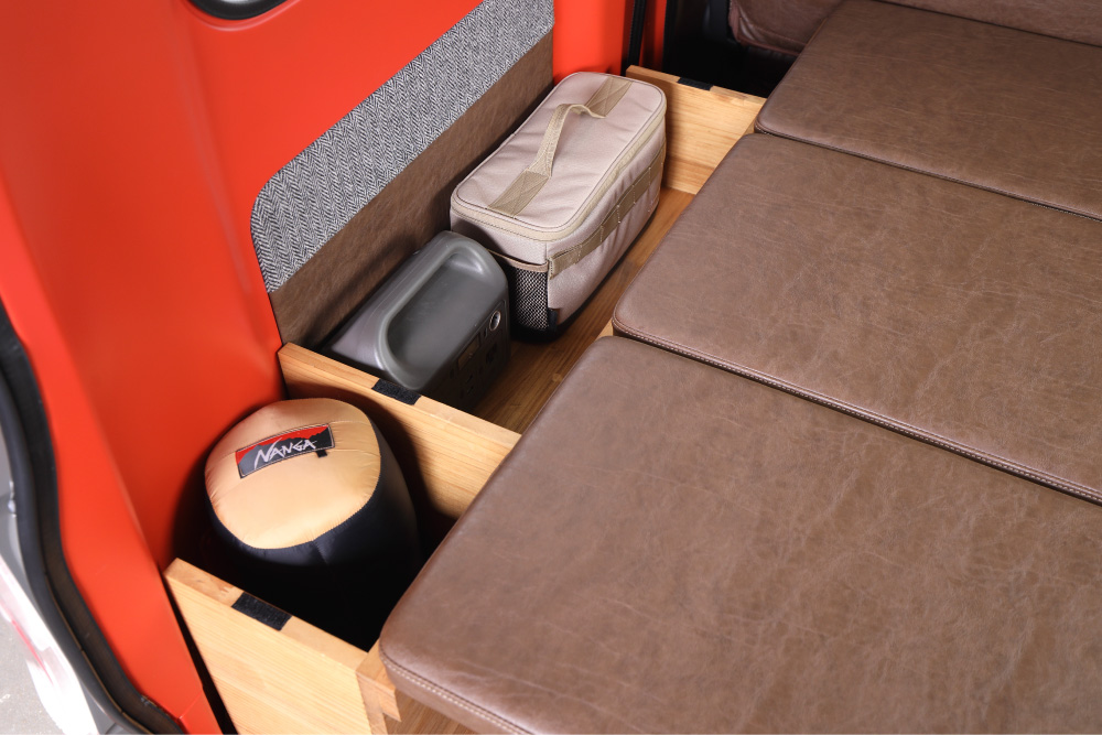 大人2名がゆったりと就寝可能なスペースが確保できます。もちろんベッドマットの下は大容量の収納スペースとなるためシュラフや毛布、ポータブル電源など、遊びのキャンプギアも多数収納できます。