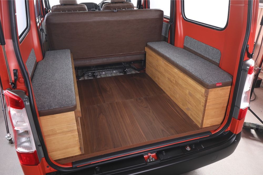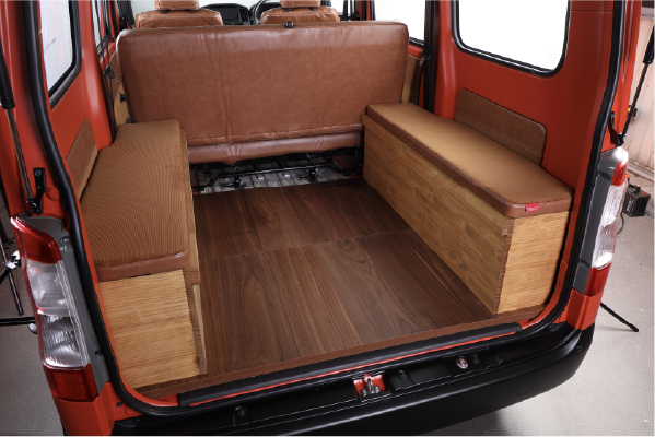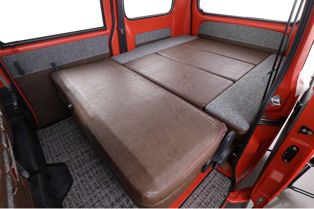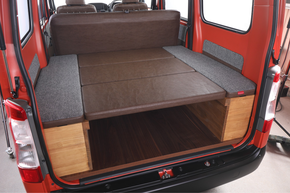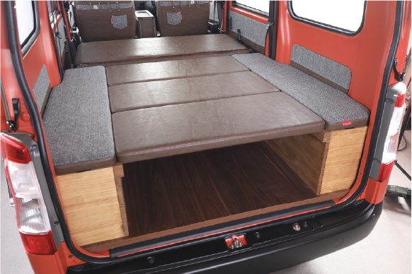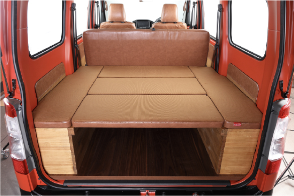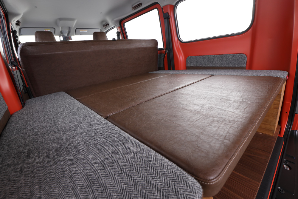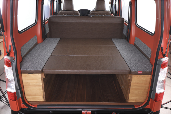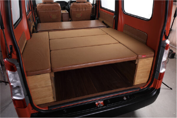 さらに2列目の純正シートを前へと倒した際にベッドマットとフラットになるように高さを設計しているため車内のベッドスペースは広々。