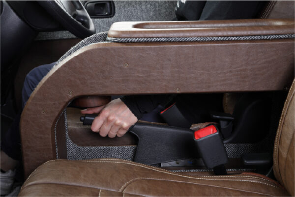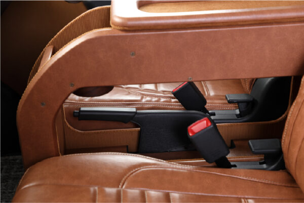 小物や肘が置けて便利な上にサイドブレーキ操作という純正の重要機能をスポイルすることなく快適性能だけをアップさせた運転する人の気持ちに寄り添った、使い勝手のいいギミック多数のセンターコンソール。