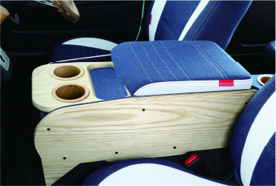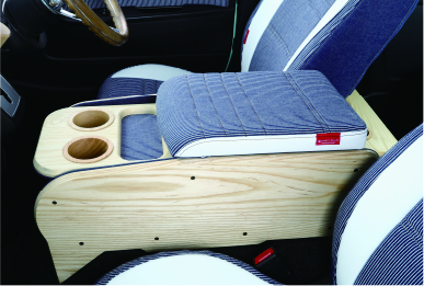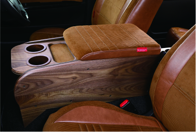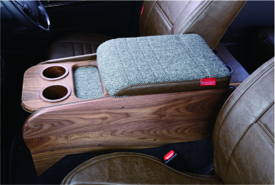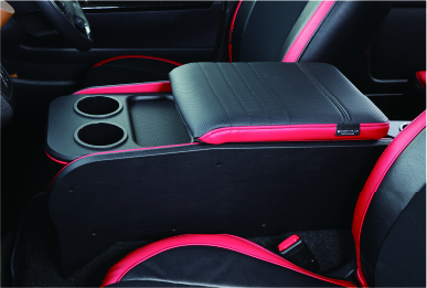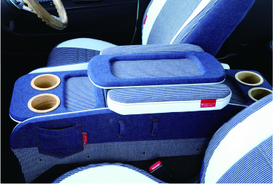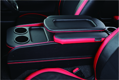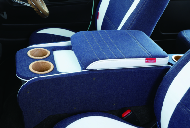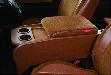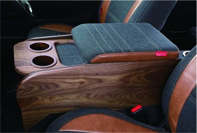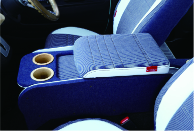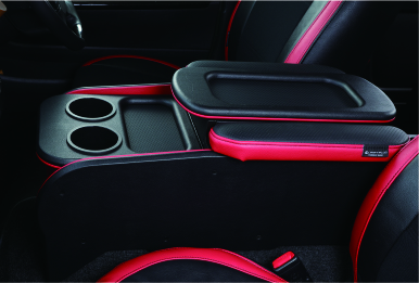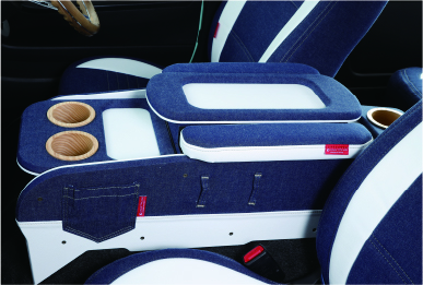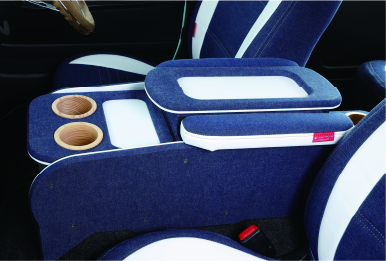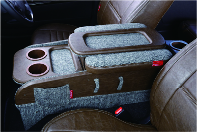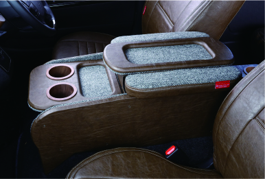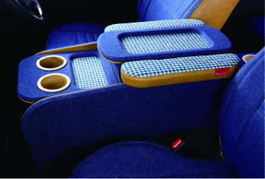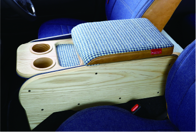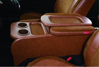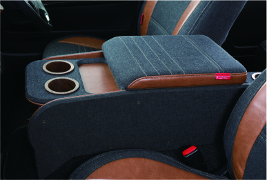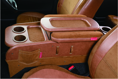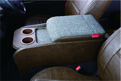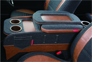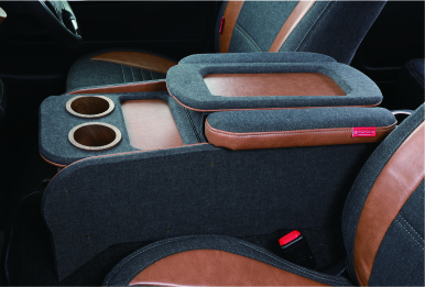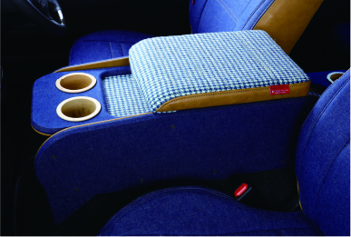 視線は前のまま飲み物に手を伸ばし、こぼさずサッと置ける。お財布を安全に収納し、サングラスなどの小物を滑らないように置いたり…。時にドライバーのヒジを受け止め、重くのしかかる体重をも愚直にサポートする。センターコンソールがこなすべき役割は本当にたくさんあります。しかもそのどれもがノールックで行われることが多い。いわば、よくできた執事のように陰ながらサポートができること。人間工学に基づいた動線を考えた作りも求められます。言うまでもなくコクピットという視線と機能が集中する場所でのビジュアルの美しさも必須。クラフトプラスのセンターコンソールには、熟練したクラフトマンたちがこだわり抜いた匠の技が集約されています。レザーと生地のコントラストにもご注目ください。